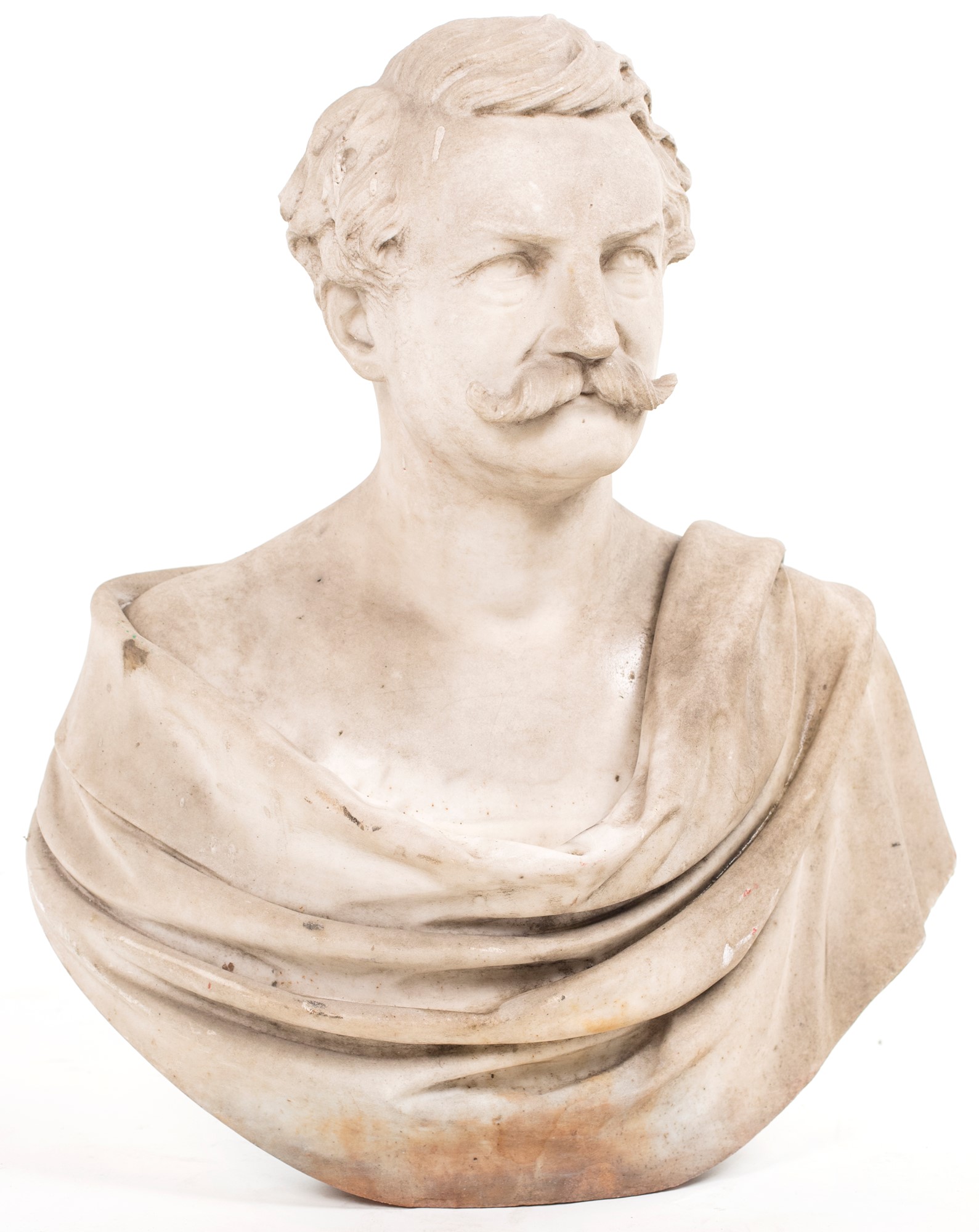 Busto in marmo bianco, XIX secolo raffigurante gentiluomo togato con baffi cm 65x60x38