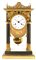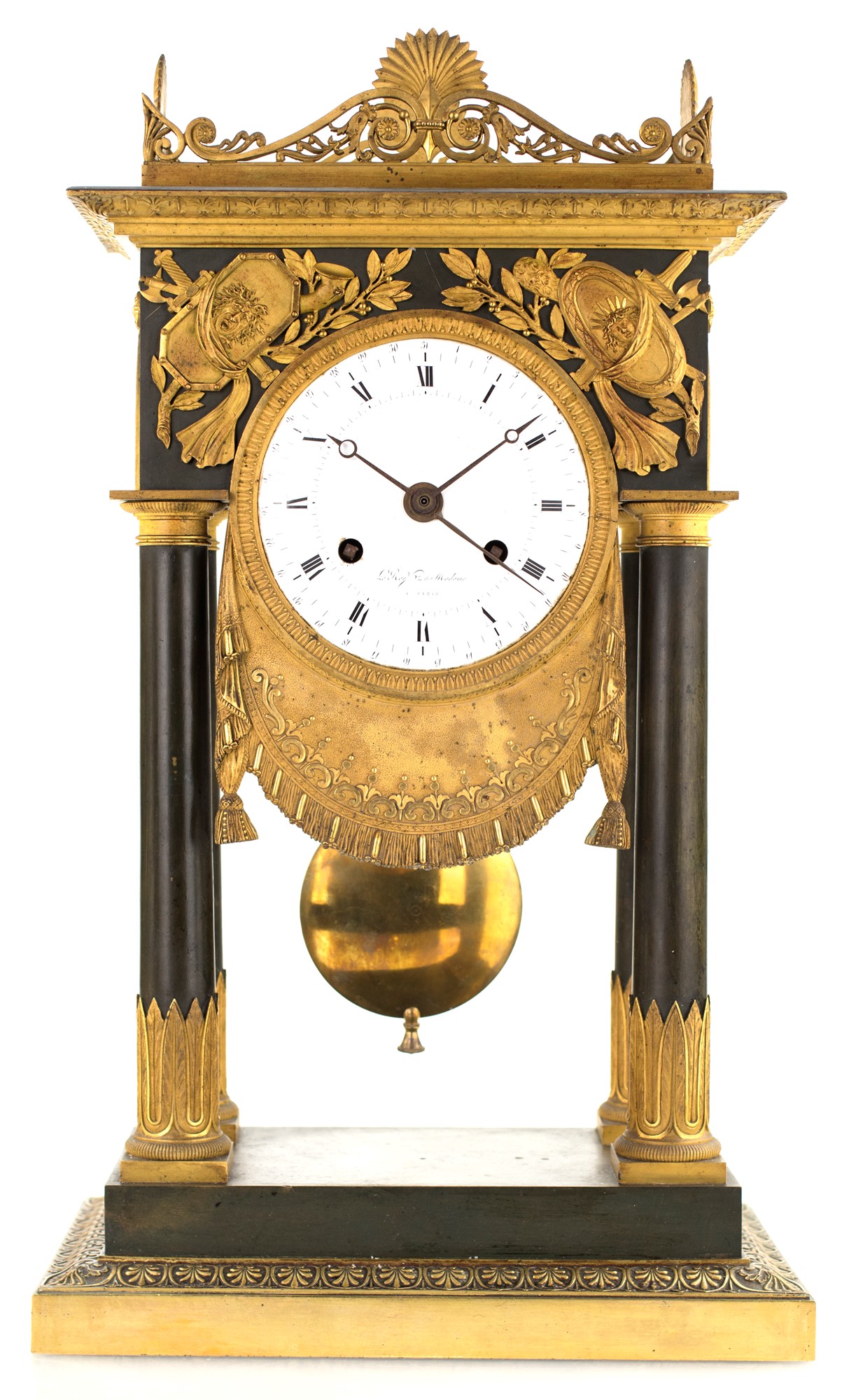 Pendola a portico in bronzo brunito e dorato, Francia, XIX secolo con quattro colonne e panoplie d'armi disposte sulla cornice superiore e quadrante circolare in smalto bianco a due fori di carica sorretto idealmente da un drappo; fascia oraria a cifre romane circondata da datario indicato a numeri arabi. Quadrante firmato Le Roy H(orloge)r de Madame à Paris cm 57x33,5x20,5