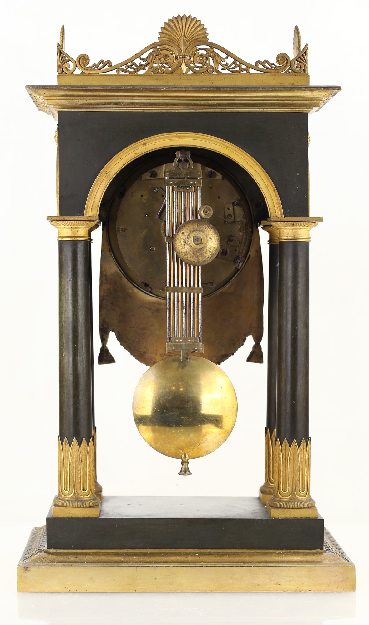 Pendola a portico in bronzo brunito e dorato, Francia, XIX secolo con quattro...