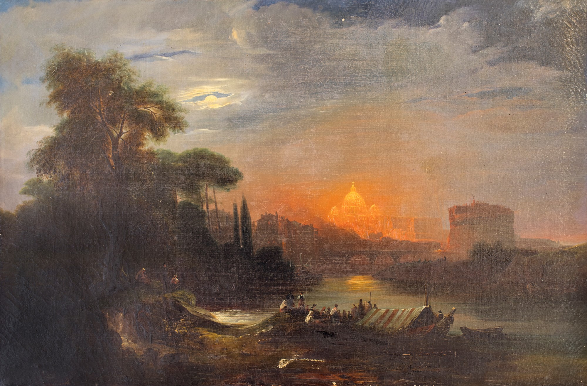 Pittore degli inizi del XIX secolo Veduta di Roma e tramonto sulla Basilica...