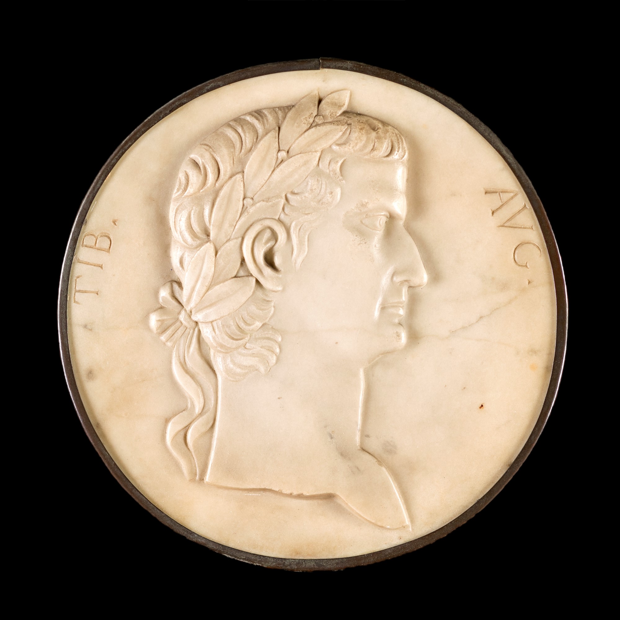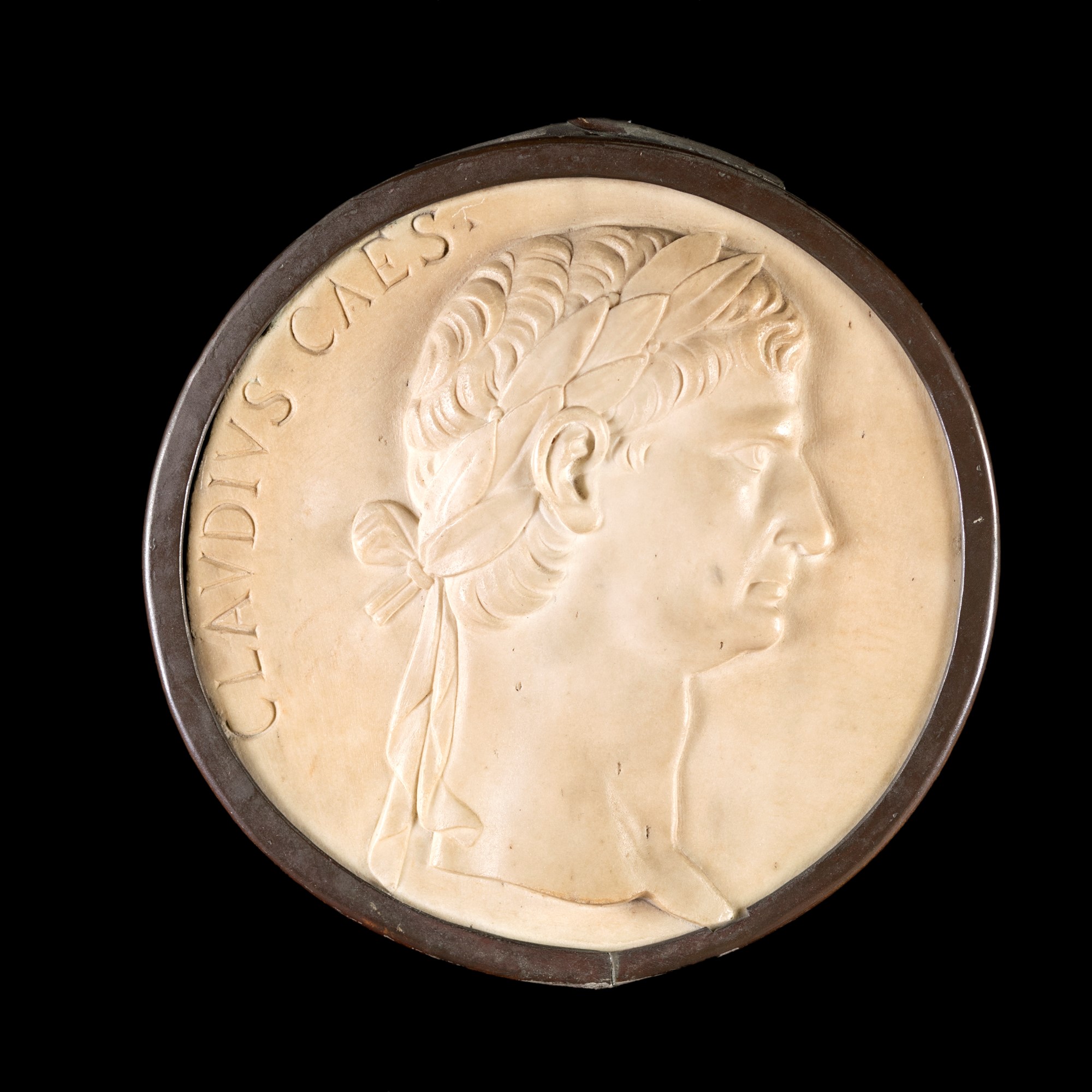 Due medaglioni circolari a cameo rispettivamente in alabastro e in scagliola, con profili di Claudio Cesare e Tiberio Augusto diametro cm 19