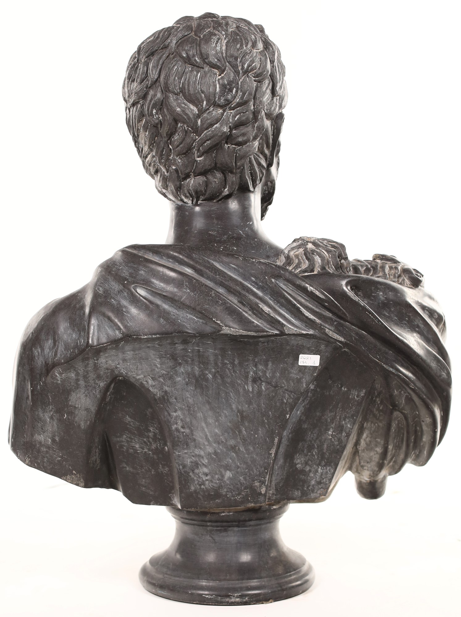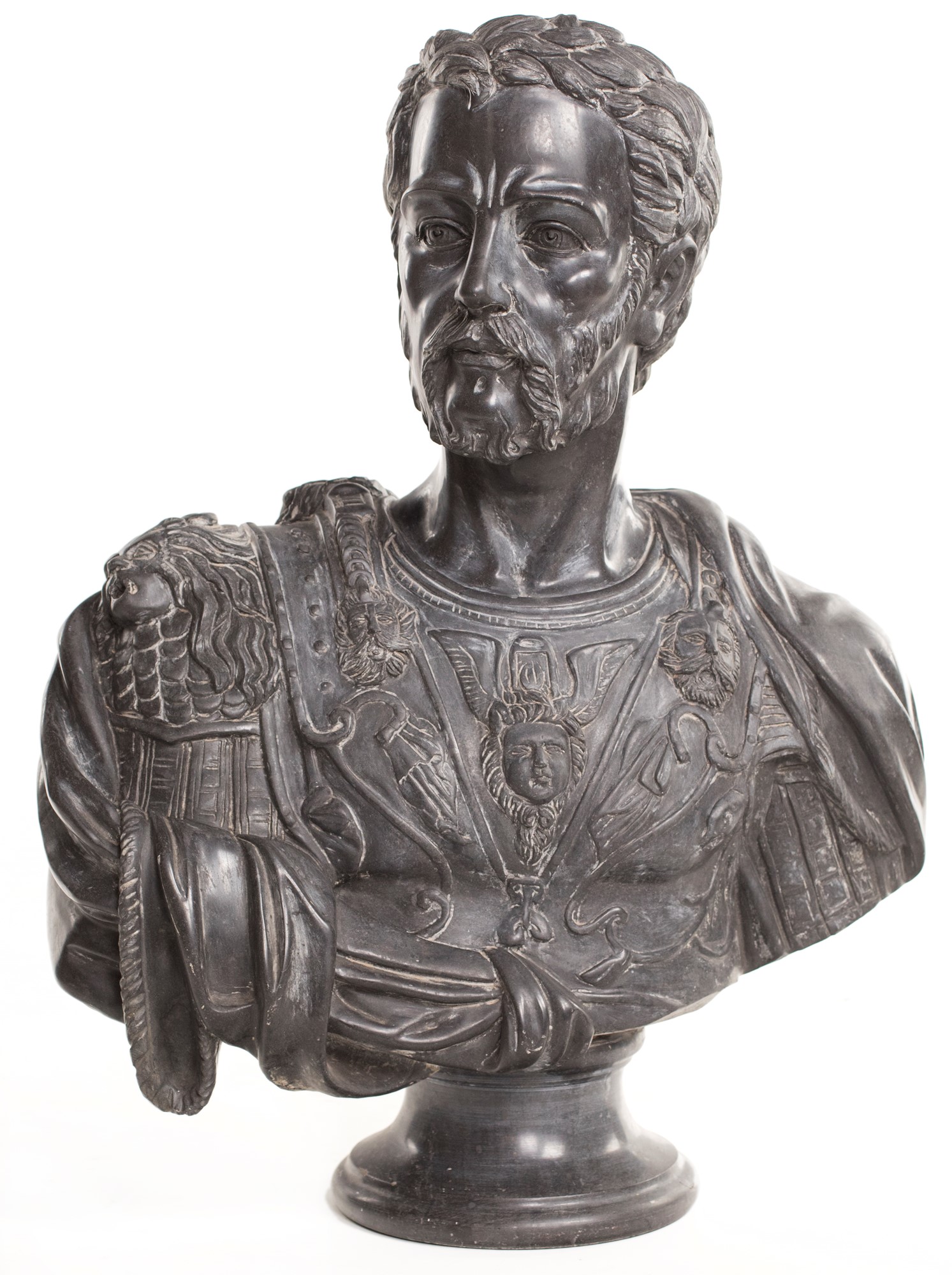 Busto di Cosimo I de Medici in marmo nero, XIX secolo dall'originale in bronzo di Benvenuto Cellini. La figura del Granduca di Toscana è presentata alla maniera dei ritratti imperiali con la testa leggermente ruotata ed una precisa attenzione ai dettagli. In particolare le preziose decorazioni allegoriche e araldiche dell’armatura, sulla quale spicca l'emblema del Toson d'Oro. cm 81x60x28