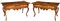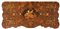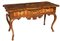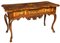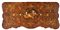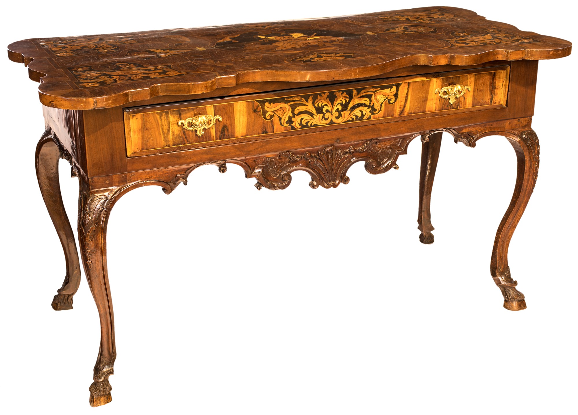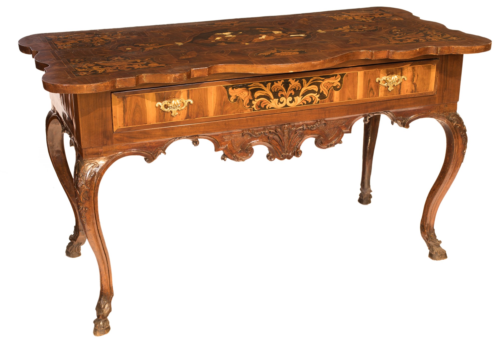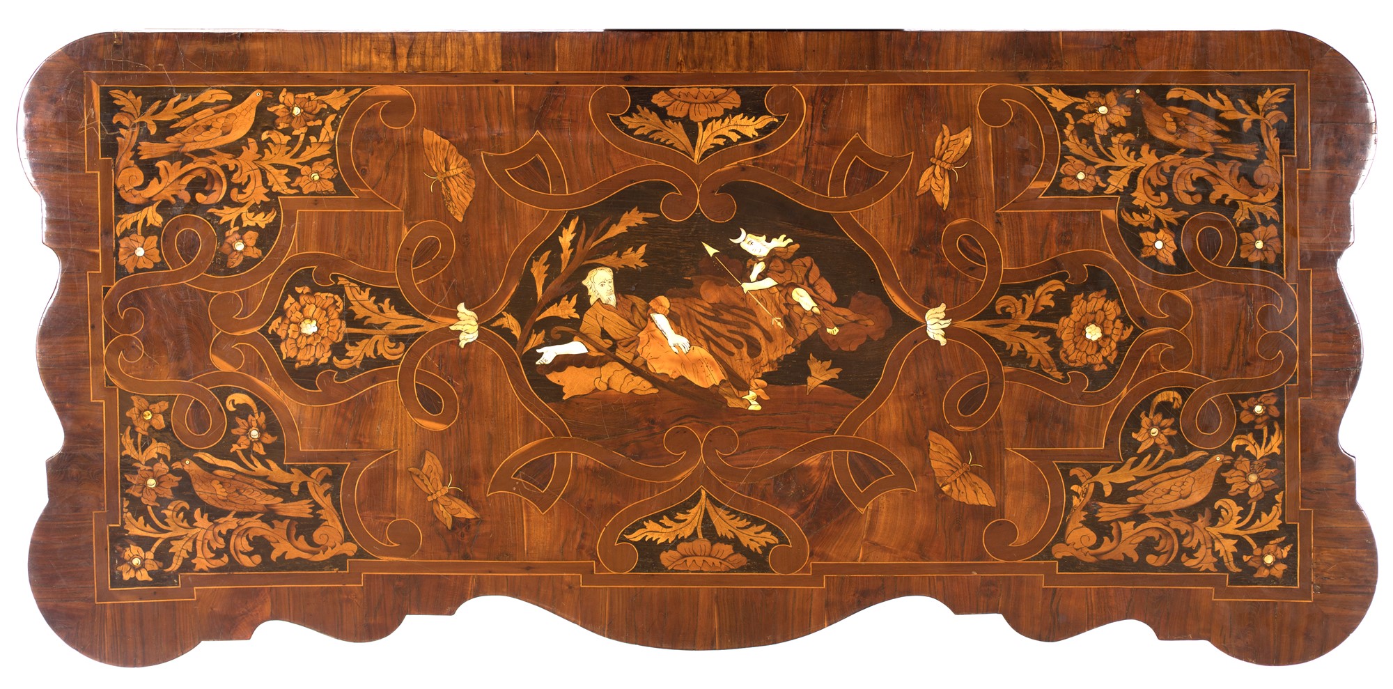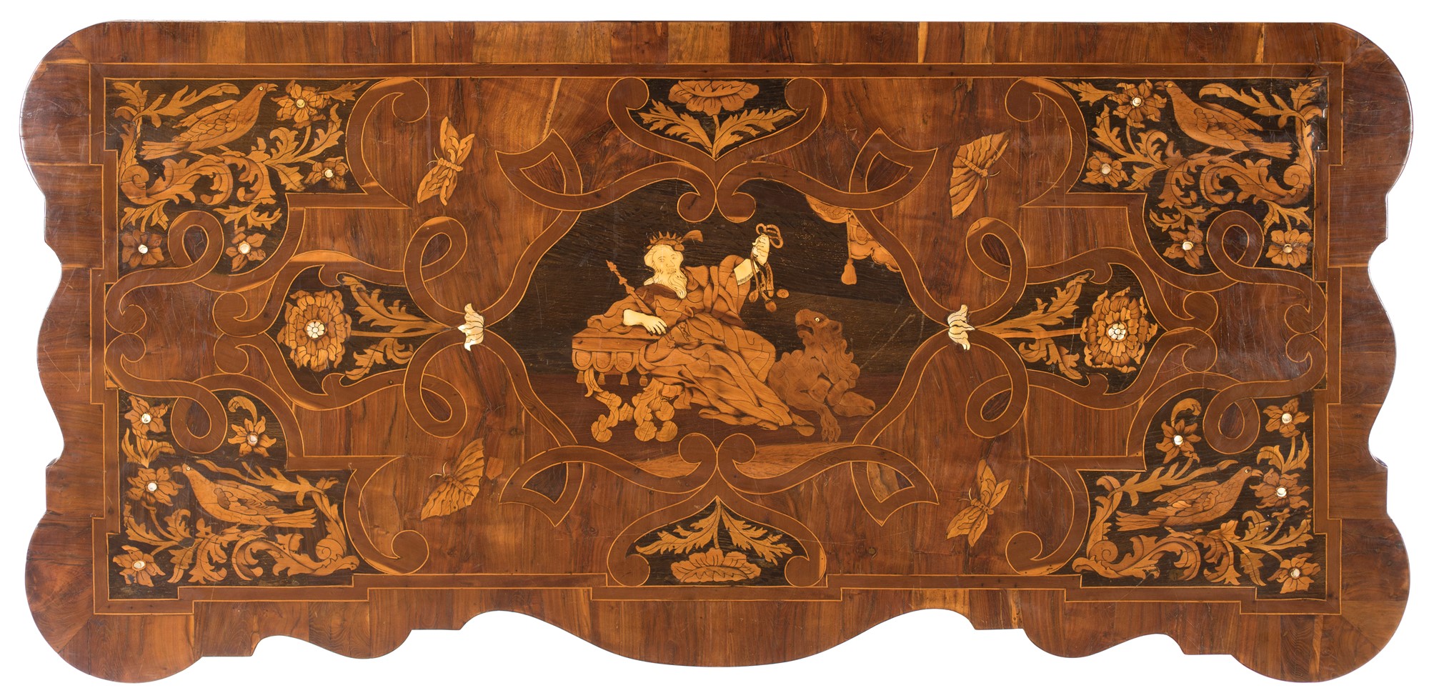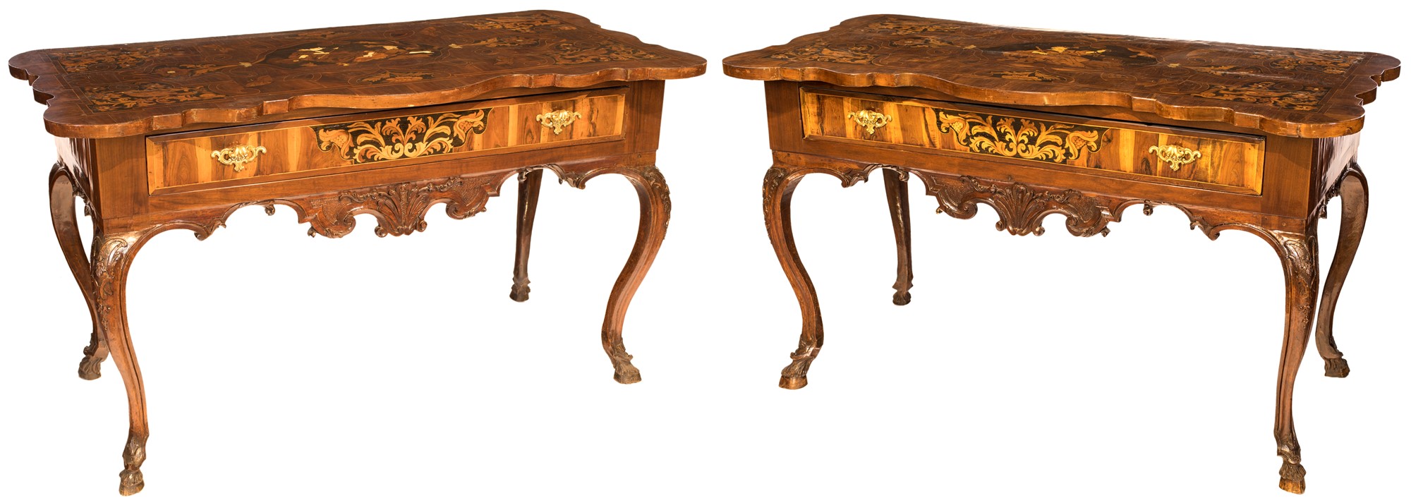 Coppia di consoles impiallacciate in noce e legni di varie essenze, Lombardia, metà del XVIII secolo con piano rettangolare dal profilo curvilineo, centrato da figure mitologiche intarsiate racchiuse entro riserva sagomata; tutt'intorno si dispongono riserve sagomate con fitta decorazione a motivi vegetali, fiori, farfalle e figure di volatile; un lungo cassetto compreso nella fascia con maniglie in bronzo dorato, reca analoga decorazione semplificata; gambe mosse poggianti su zoccoli, abbellite all'attaccatura da rilievi naturalistici intagliati cm 88x155x74