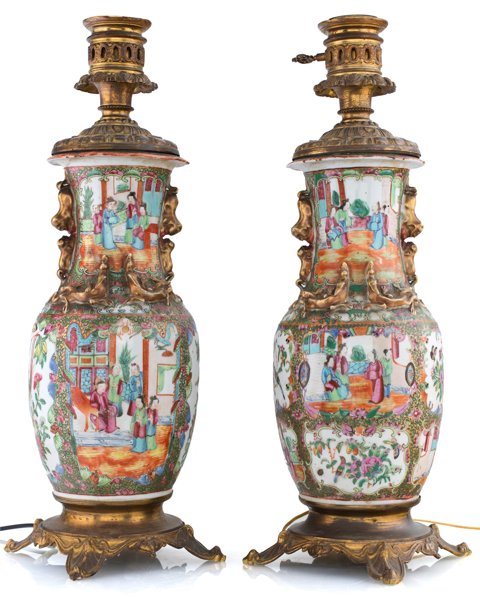 Coppia di vasi in porcellana di Canton montati a lampada, XIX secolo decorati in vivace policromia con scene di genere racchiuse entro riserve lumeggiate in oro altezza cm 60