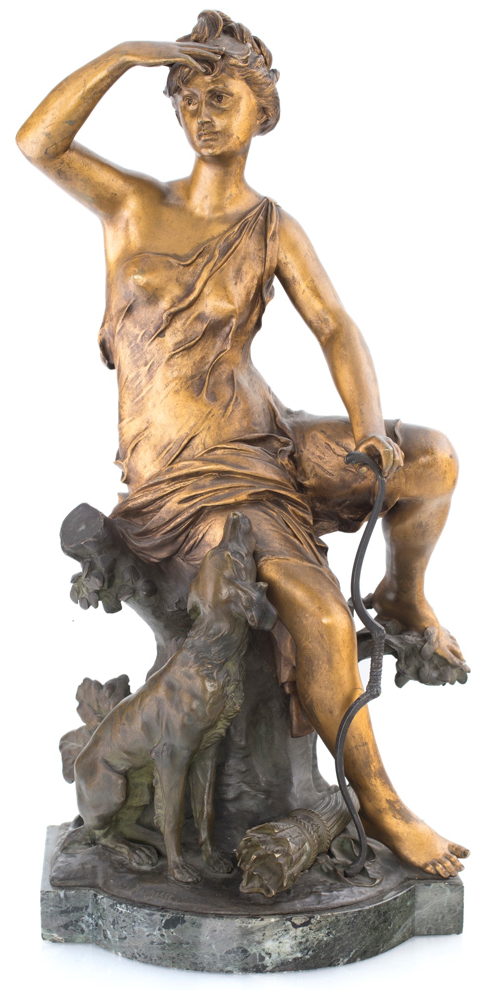 scultura in bronzo dorato e brunito raffigurante la dea della caccia affiancata da un cane, ritratta seduta a guardare l'orizzonte; supporto in marmo