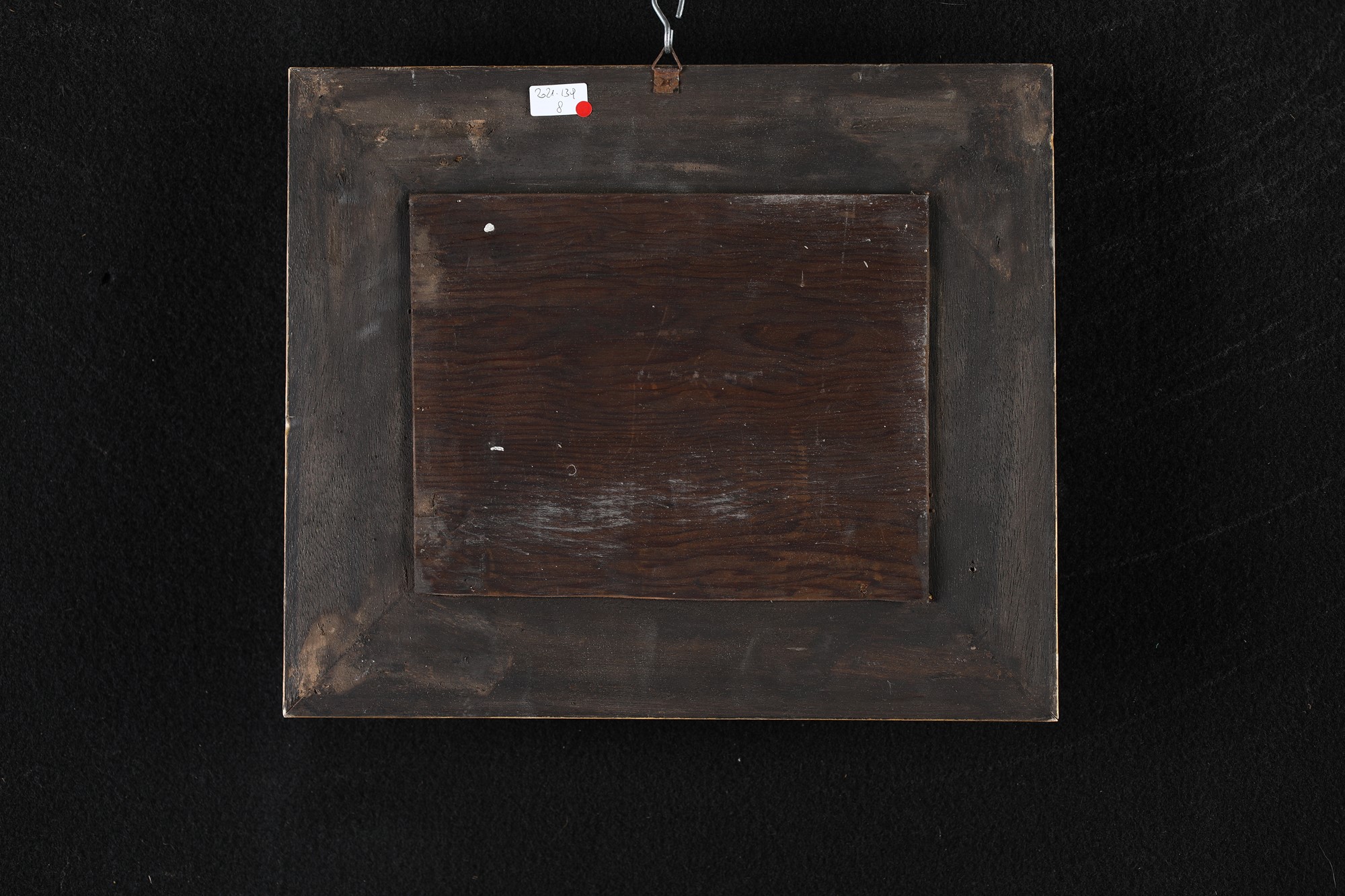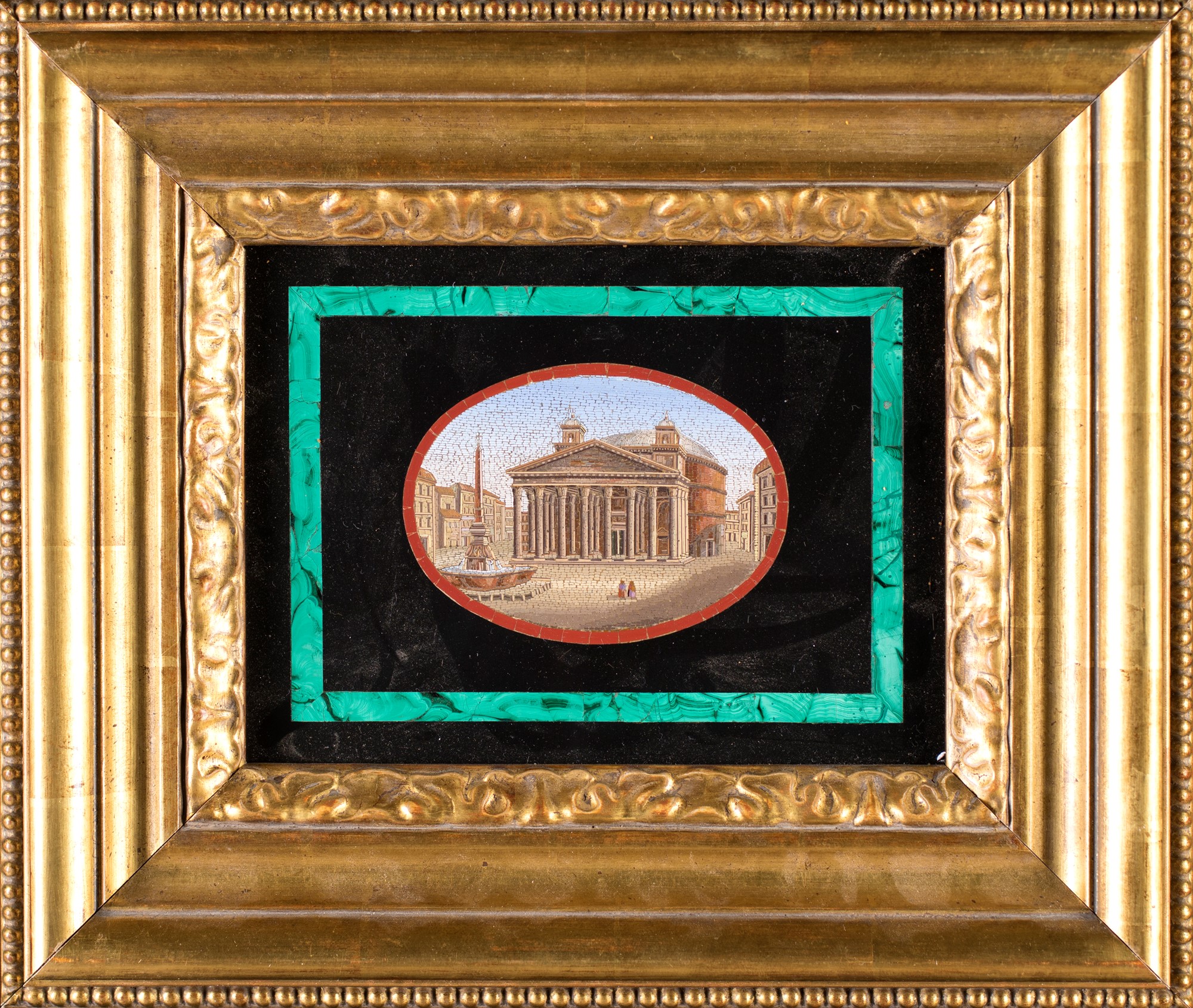 Placca musiva in marmo, Roma, XIX secolo con veduta di Piazza della Rotonda col Pantheon prima della rimozione dei campanili del Bernini, realizzato in mosaico minuto entro bordura in marmo rosso; placca rettangolare in marmo nero con profilo in malachite. Cornice modanata in legno dorato cm 16x21 (in cornice 32x37)