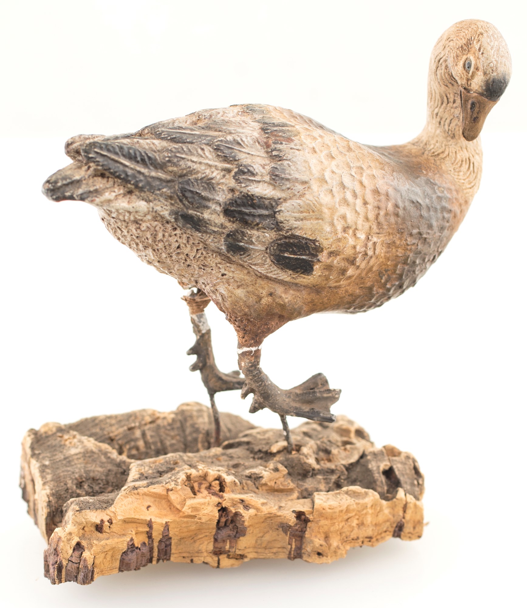 Anitra in terracotta policroma sui toni del beige e del marrone, occhi di vetro. cm 11x12,50