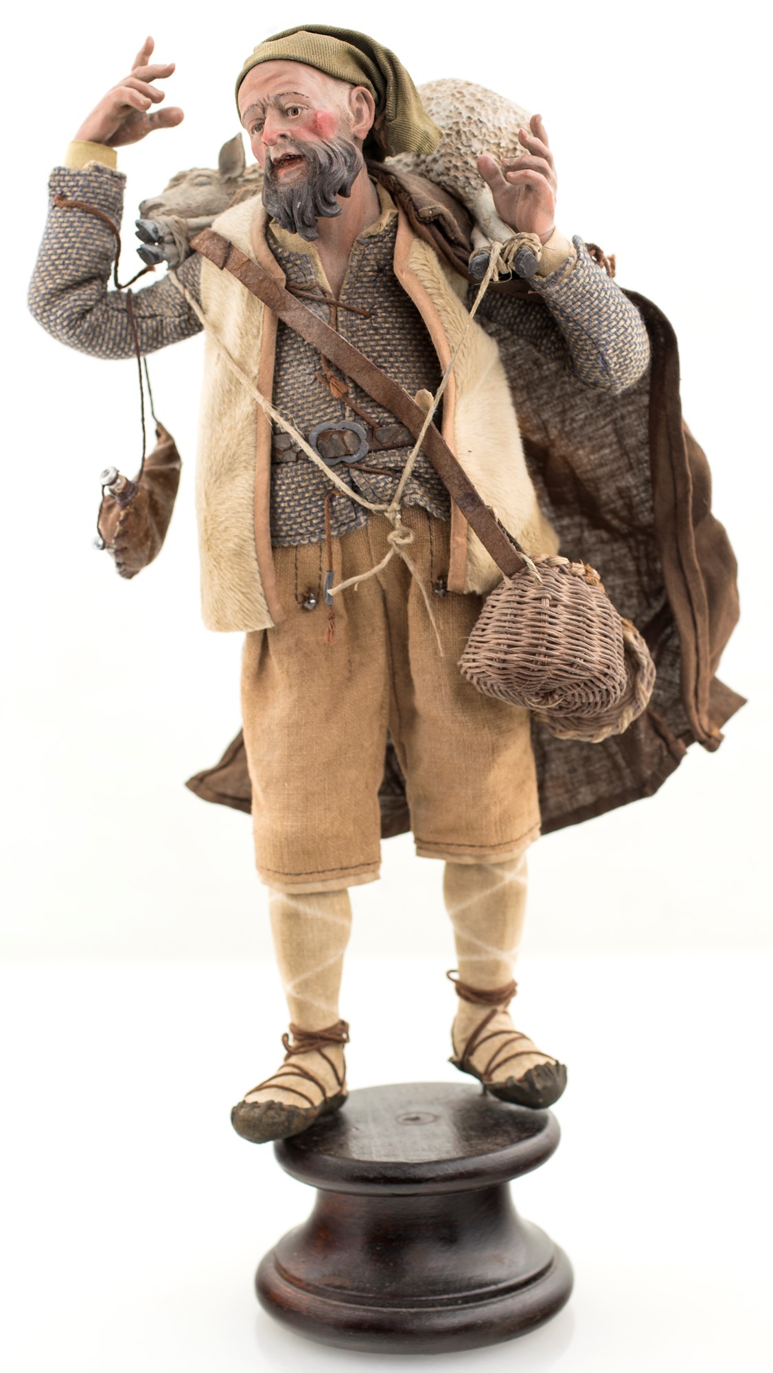 Pastore con pecorella sulle spalle Rappresenta Armenzio, padre del più noto Benino, il dormiente nel presepe napoletano. Camicia gilet in tela, camiciotto fissato da una cinta, pantaloni in tela, calzettoni e cioce ai piedi, ricco mantello con cappuccio. Pecorella in terracotta policroma sulle spalle, paniere a tracolla, borraccia in pelle.