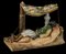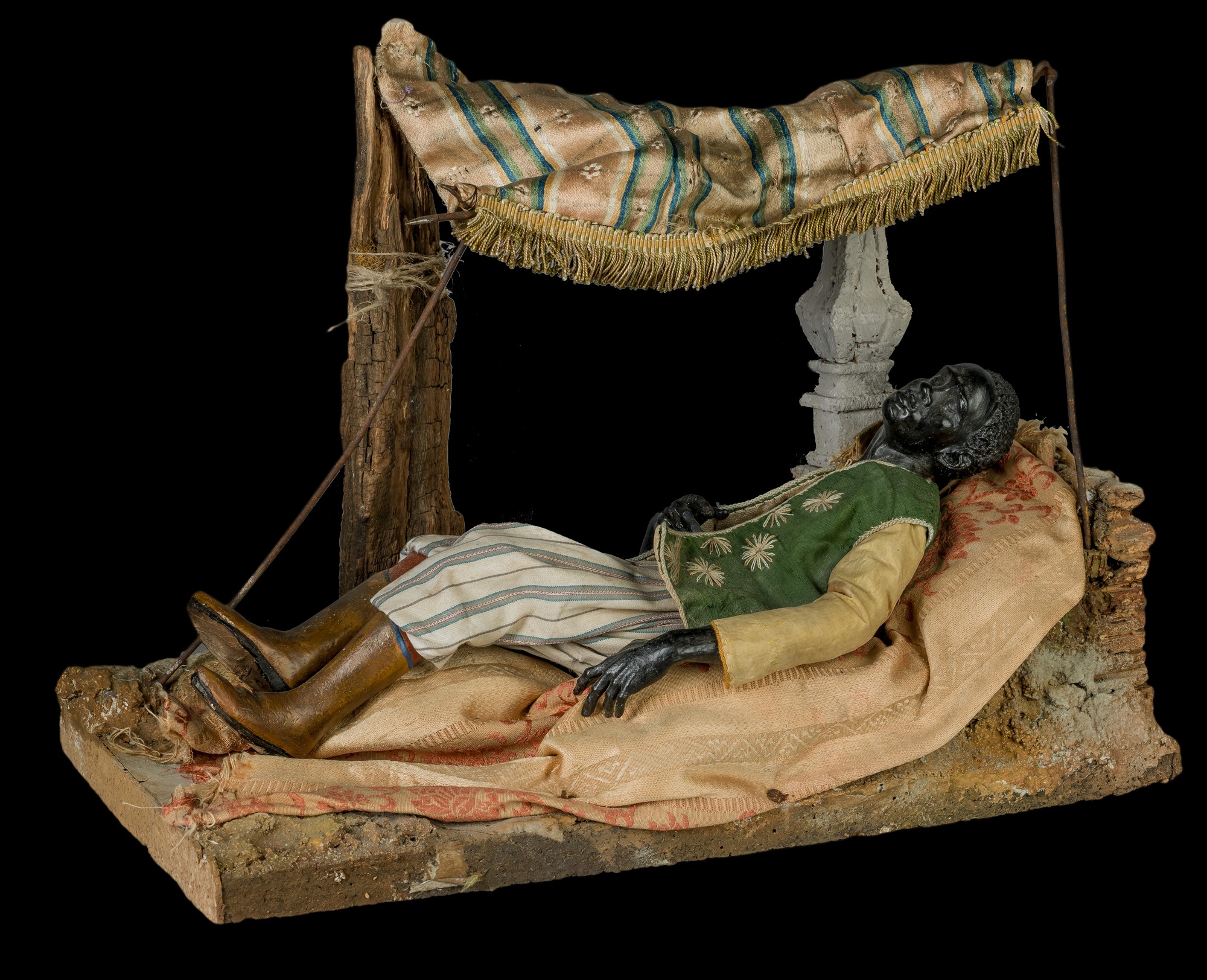 Dormiente moro sotto una tenda camicia in tela color avorio, panciotto beige, gilet verde, fusciacca beige, pantaloni bianchi a righe, stivali marroni. cm 38