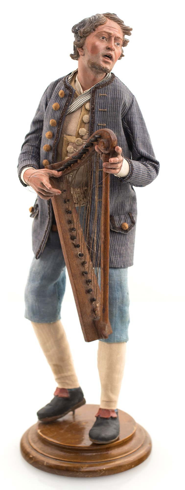 Suonatore d'arpa Camicia, panciotto con ampi bottoni, giacca con ampie tasche, pantaloni grigio azzurro, scarpe nere con fibbia marrone. Accessori: arpa in legno.