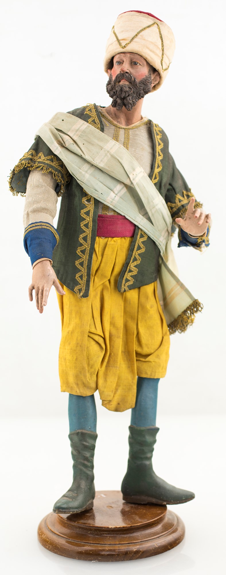 Dignitario orientale Folta barba e codino, camicia, panciotto color avorio con alamari dorati, fascia di seta a tracolla, giacca verde con alamari dorati da cui escono le maniche. Pantaloni gialli, stivali di colore verde, turbante avorio e rosso.