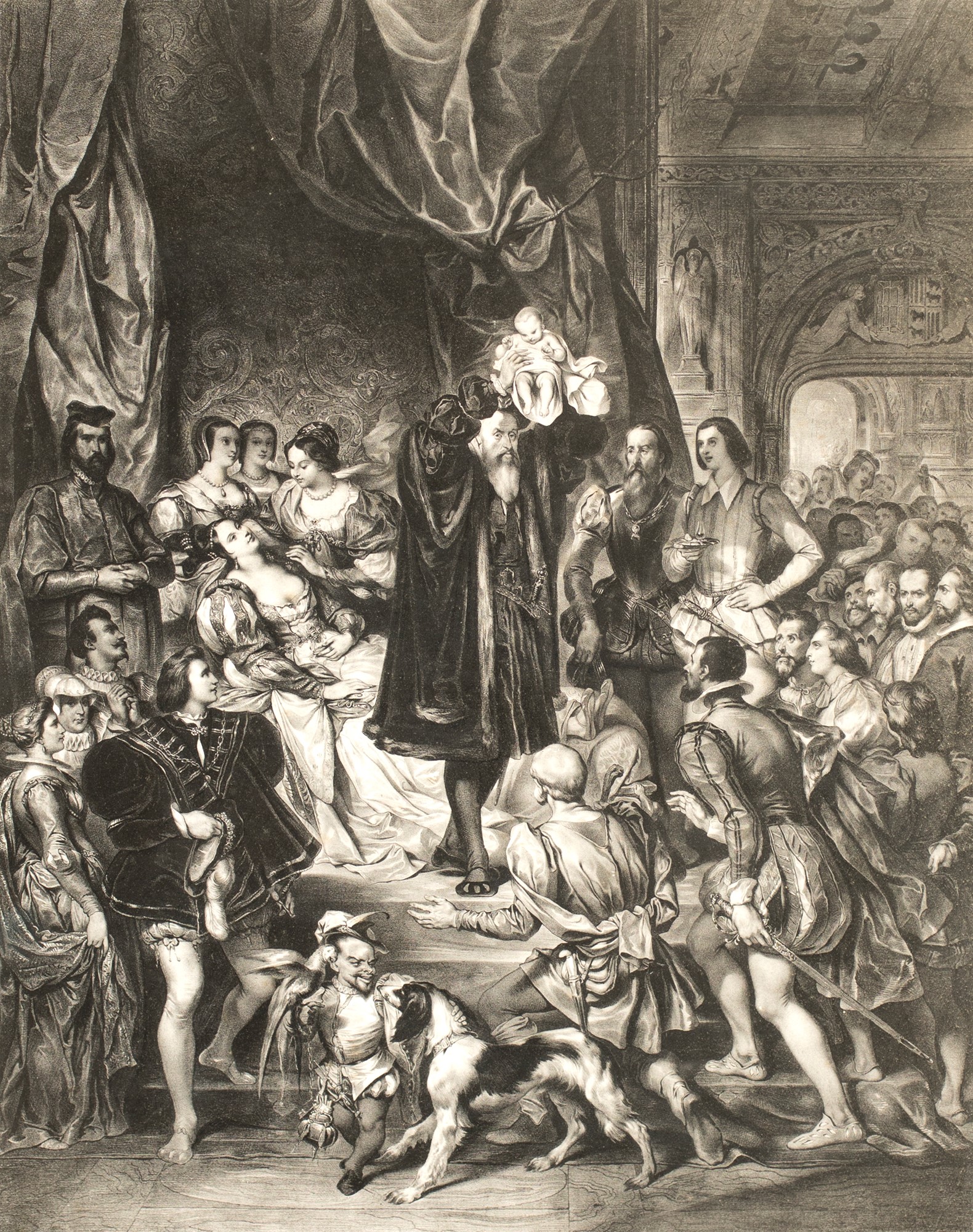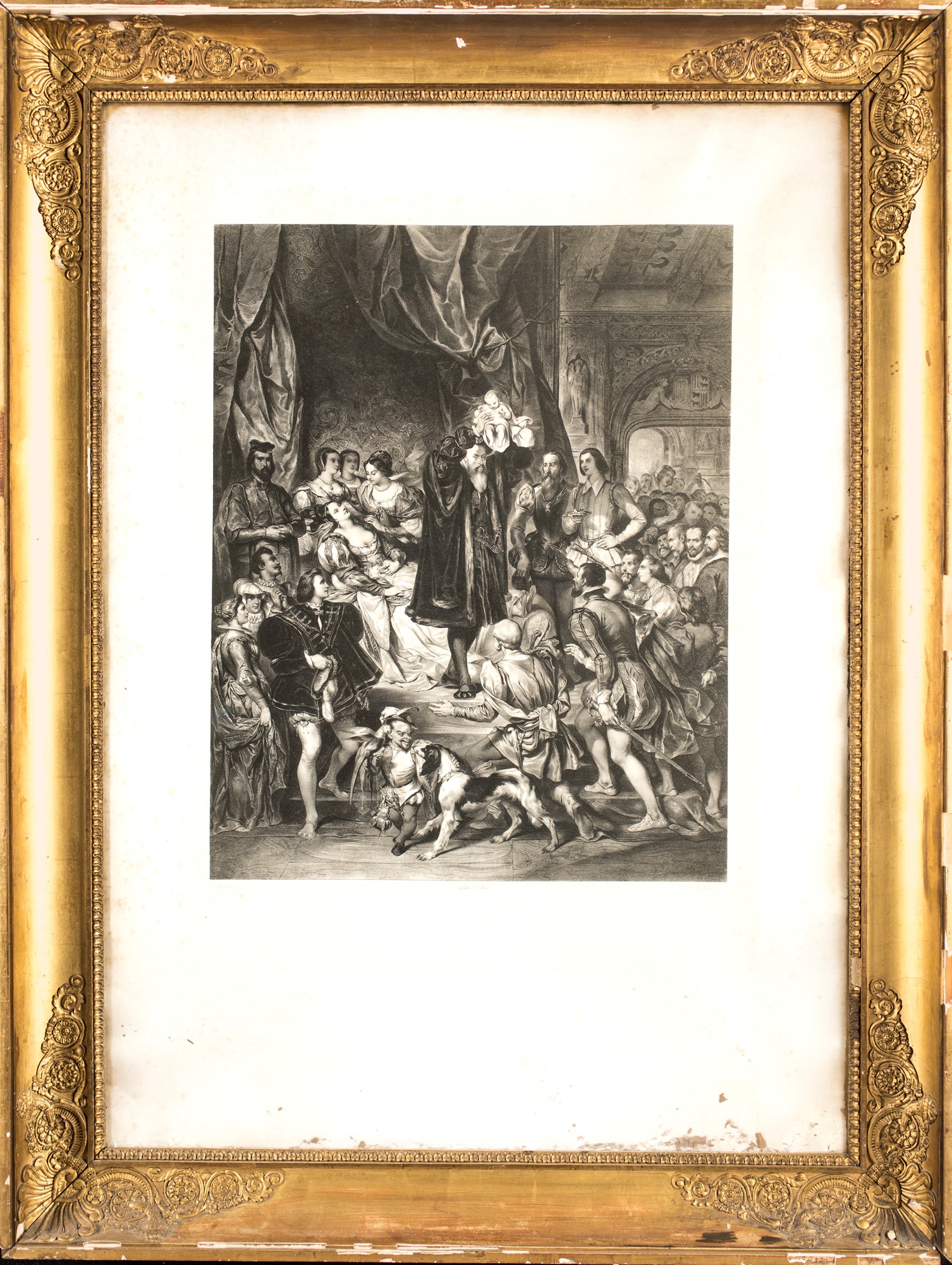 La nascita di Enrico IV dal dipinto di Eugène Déveria del 1827, stampata presso E. Ardit. Dedica manoscritta a matita in basso a sinistra acquaforte cm 76x57 (la lastra) - con la cornice: cm 122x92