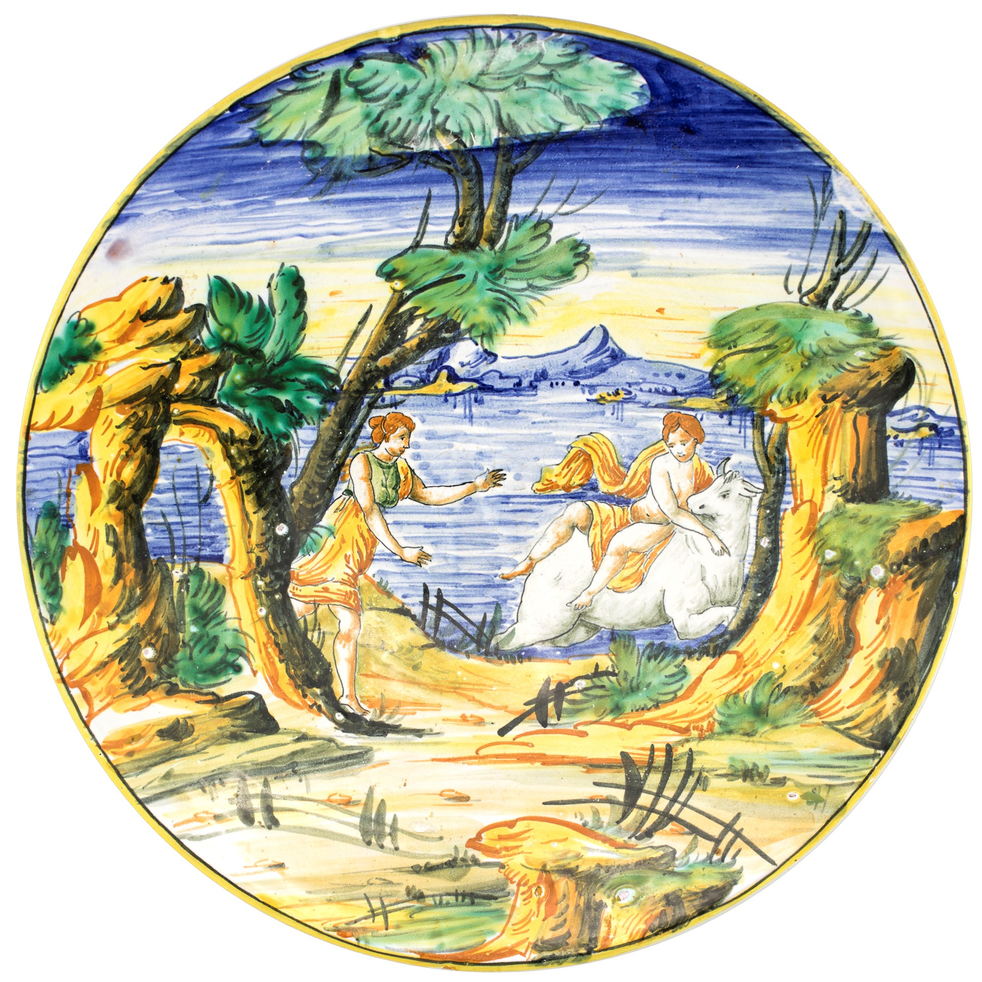 Piatto in ceramica di Castelli decorato da un paesaggio con figura di Europa...