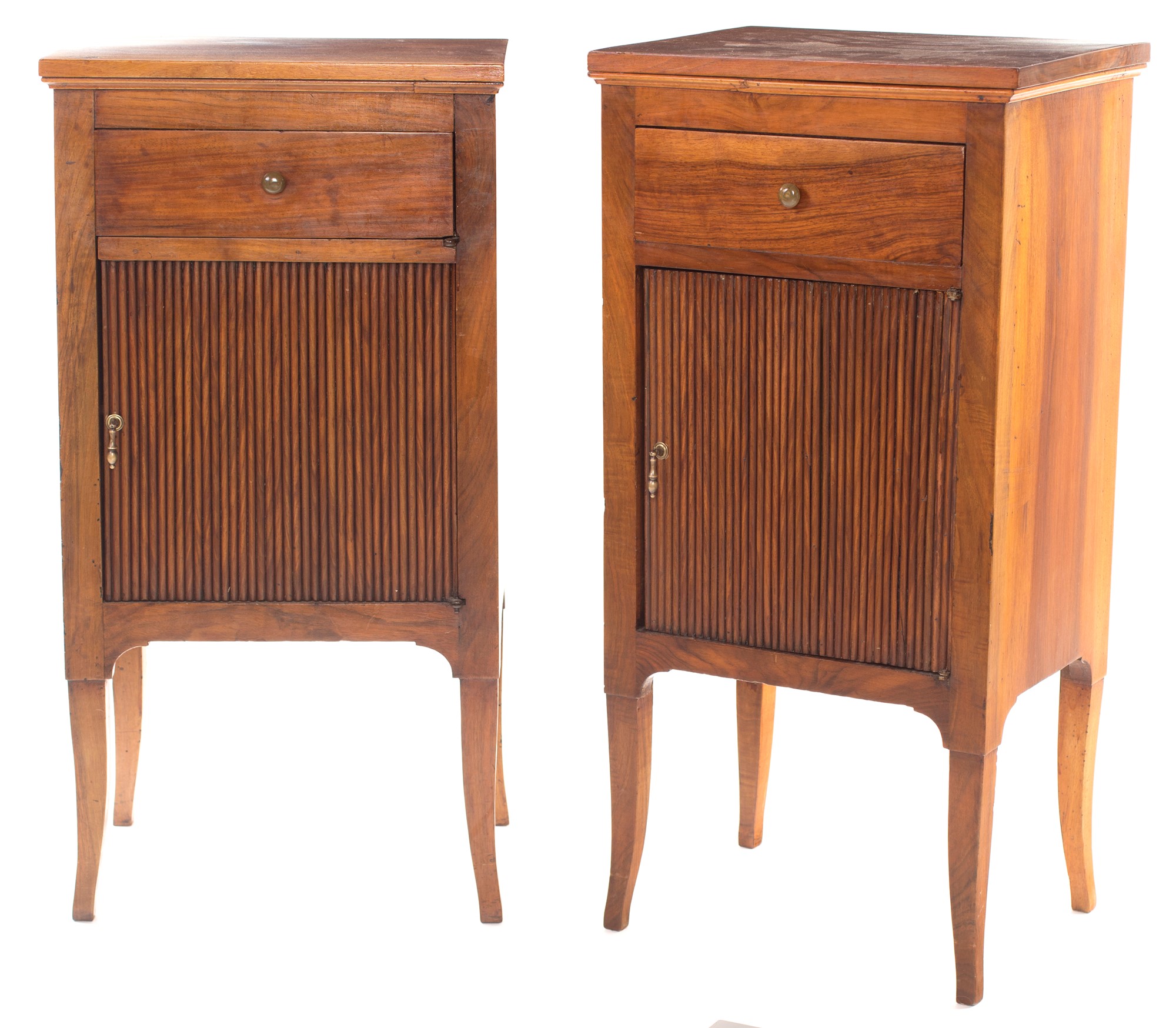 Coppia di comodini in noce, XIX secolo con un cassetto ed uno sportello sottostante decorato da nervature verticali a simulare una serrandina, gambe rastremate cm 88x43x33