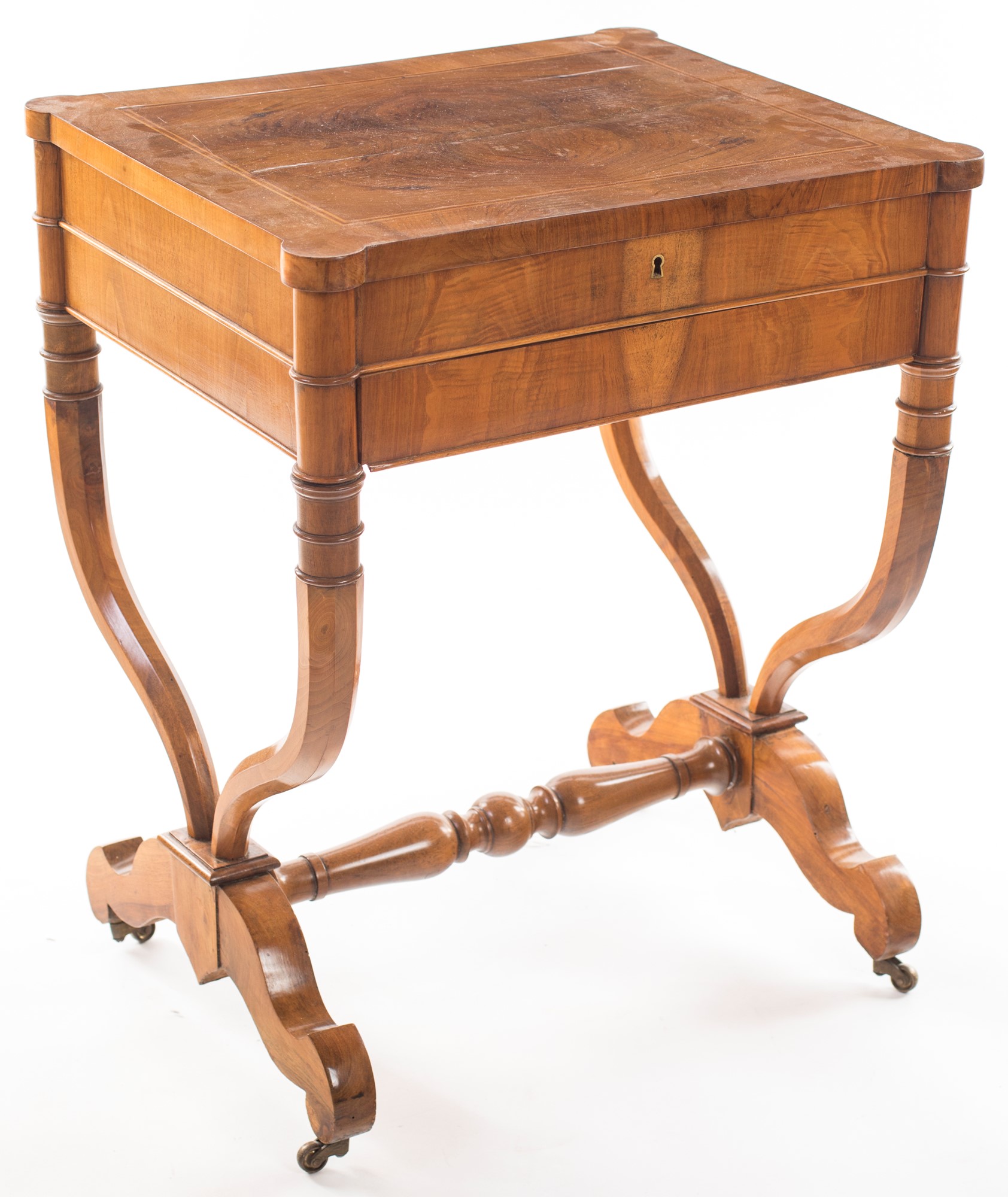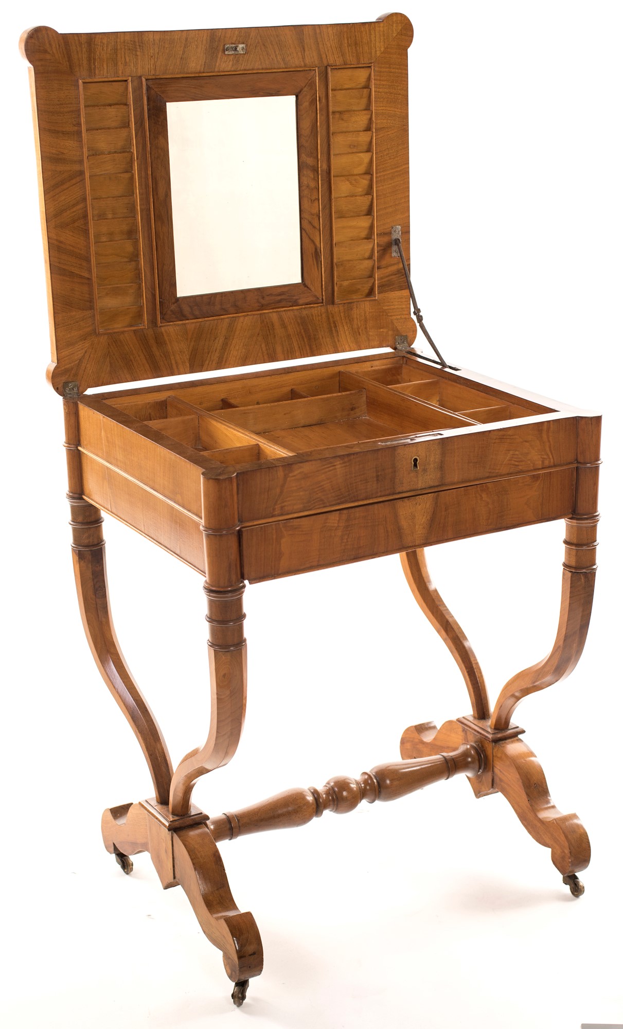 Tavolino da lavoro in ciliegio, fine del XIX secolo con sottili filettature in legno di frutto; piano rettangolare ad angoli prominenti arrotondati, incernierato, con specchio al verso delimitato da due portabiglietti e numerosi divisori interni di diversa misura; un cassetto nella fascia anch'esso suddiviso in scomparti, gambe incrociate riunite da traversa cm 74x59x49
