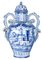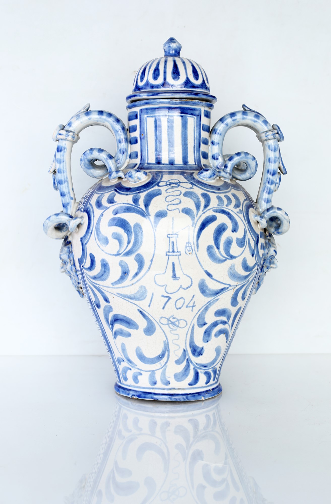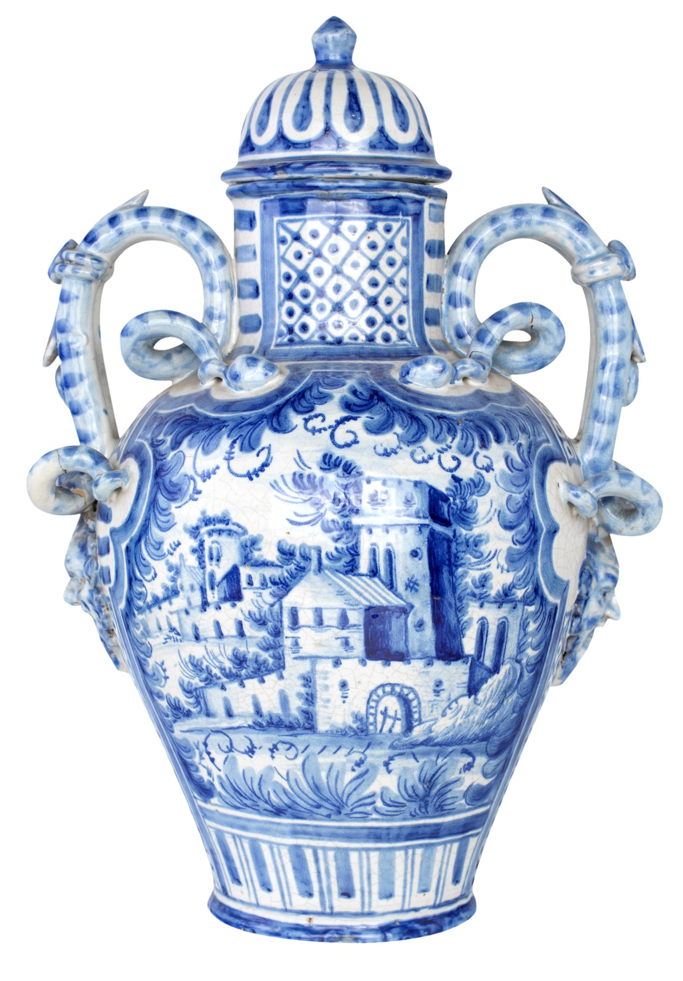 Vaso con coperchio in porcellana bianca e blu, Savona, XIX secolo con anse serpentiformi emergenti da un mascherone e coperchio a cupolino; decorazione frontale con paesaggio architettonico ed al verso marca lanterna con data 1704 altezza cm 50