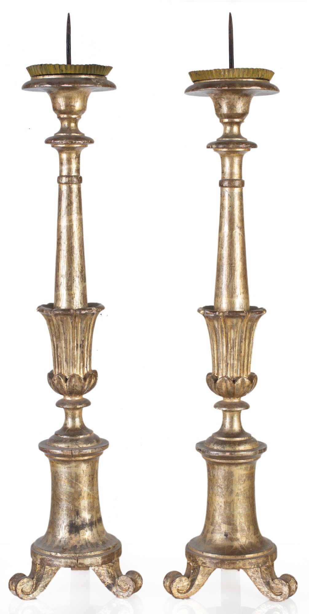 Coppia di torciere in legno dorato, fine del XIX/inizi XX secolo con alto fusto a balaustro sormontato da piattello in rame, base a rocchio di colonna su tre piedi a ricciolo altezza cm 80