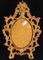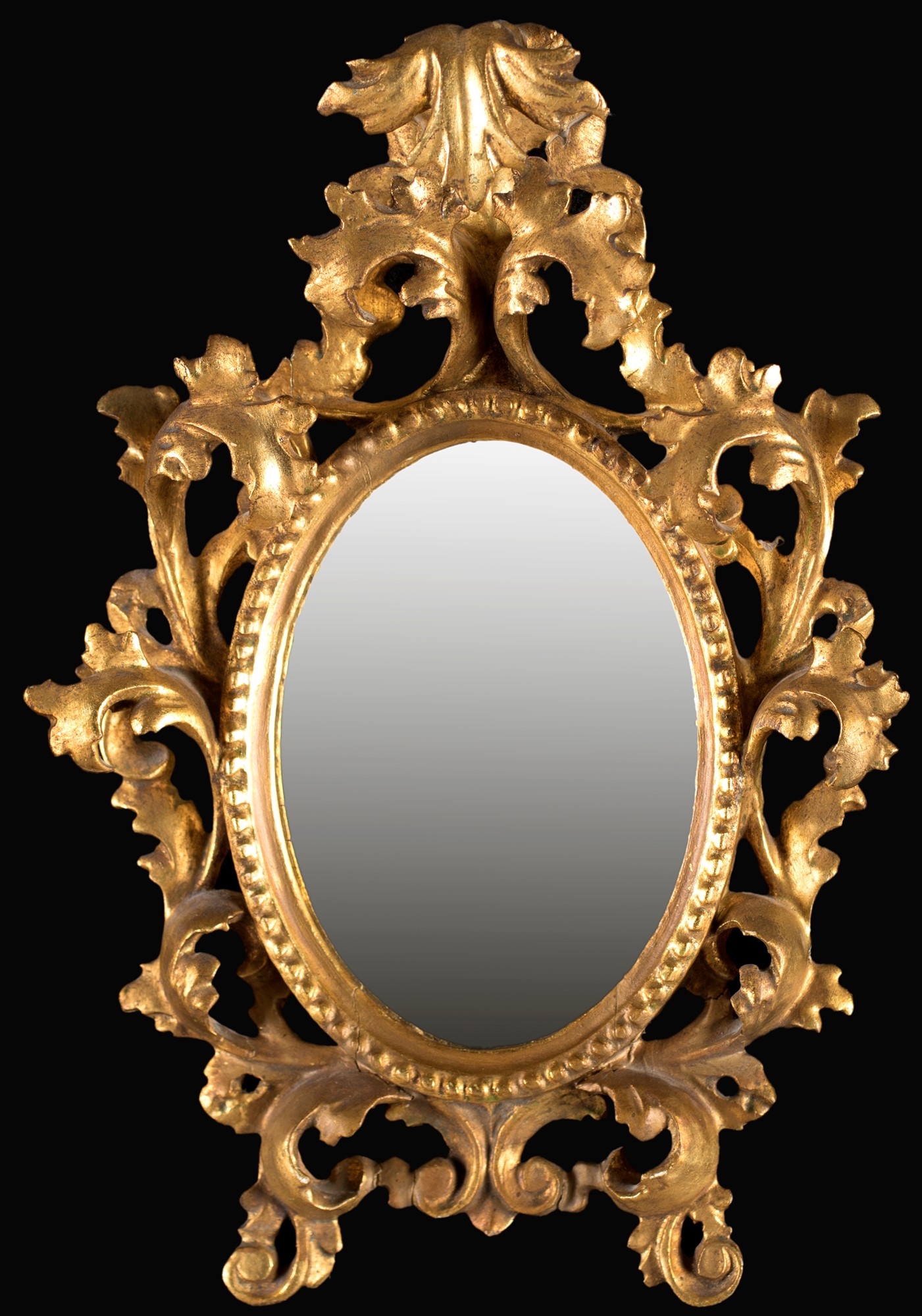 Specchierina in legno dorato, Toscana, XIX secolo con cornice ovale racchiusa da perline, circondata da larghe volute vegetali che si inseguono lungo l'intero perimetro cm 37x25