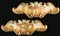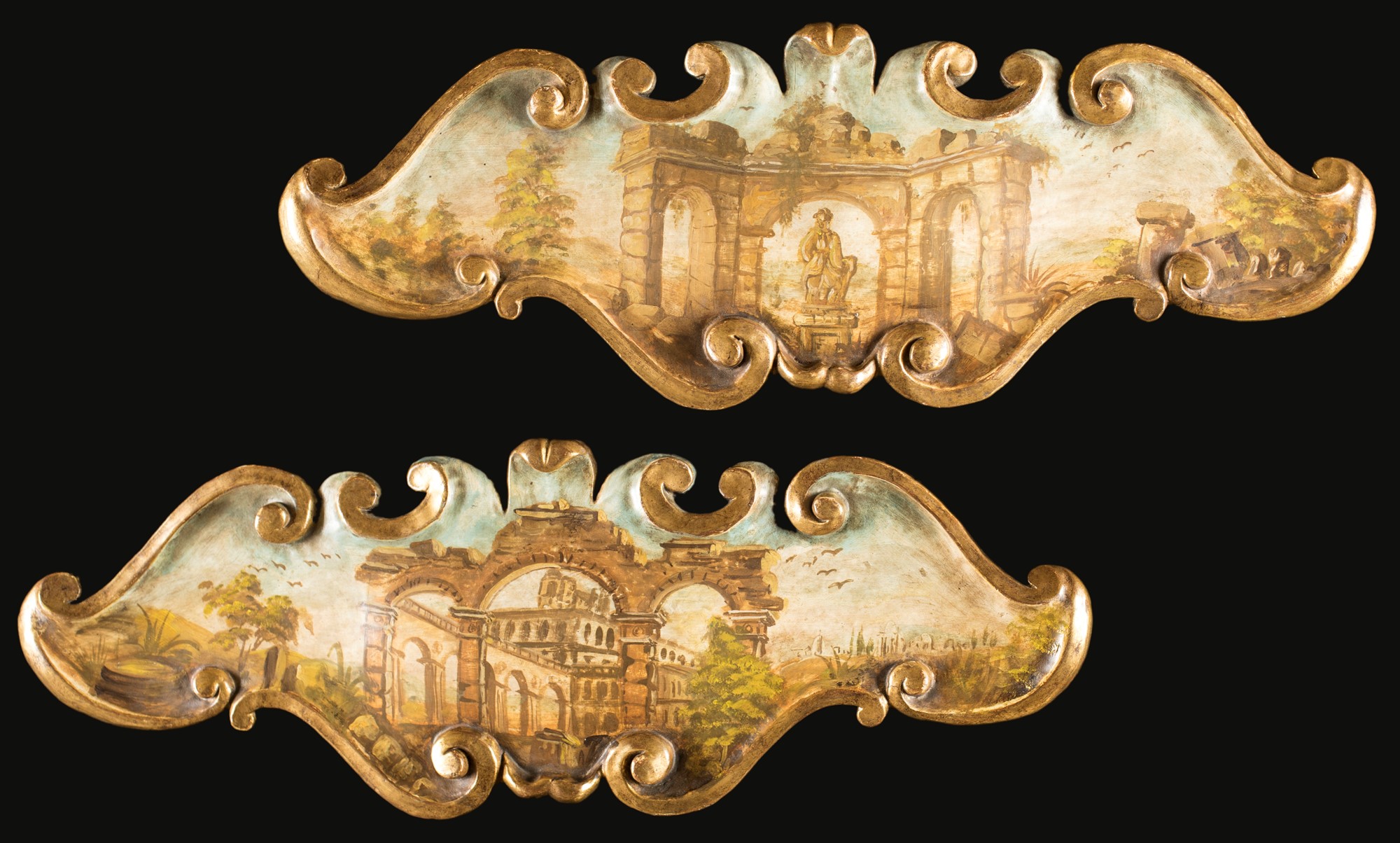 Coppia di fregi sovrapporta in legno sagomati a forma di cartiglio con margini ricurvi, decorati da paesaggi dipinti e profili dorati cm 21x62