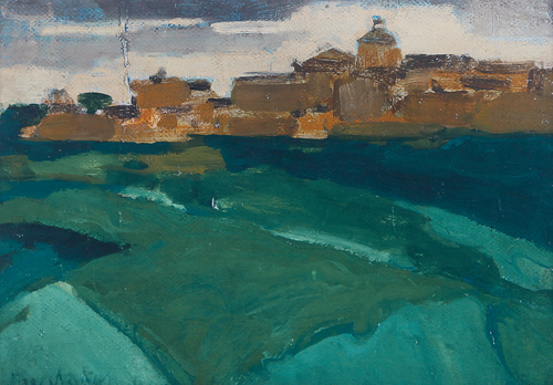 DOMENICO CANTATORE Ruvo Di Puglia (Ba) 16/03/1906 - Parigi 22/05/1998 Paesaggio, 1963 olio su faesite cm. 25x35, firma in basso a sinistra, etichette e timbri delle Gallerie Forni (BO), Carini (MI) e Sianesi (MI) al retro.