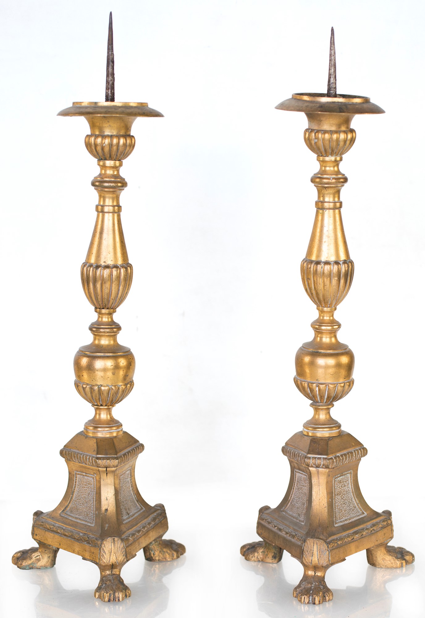 Coppia di piccole torciere in bronzo dorato, fine del XVIII secolo con fusto a balaustro su base trilobata sorretta da piedi ferini altezza cm 40