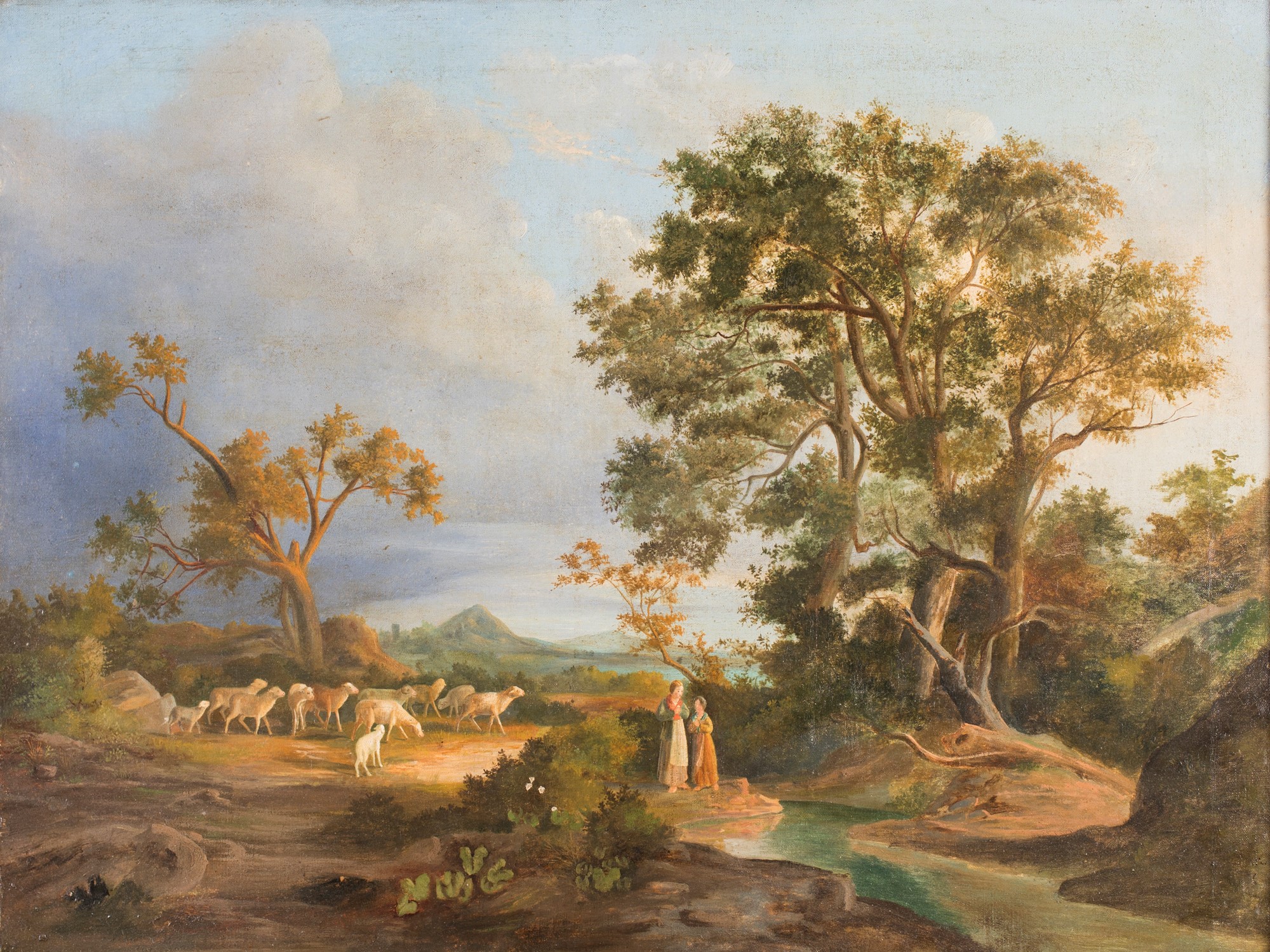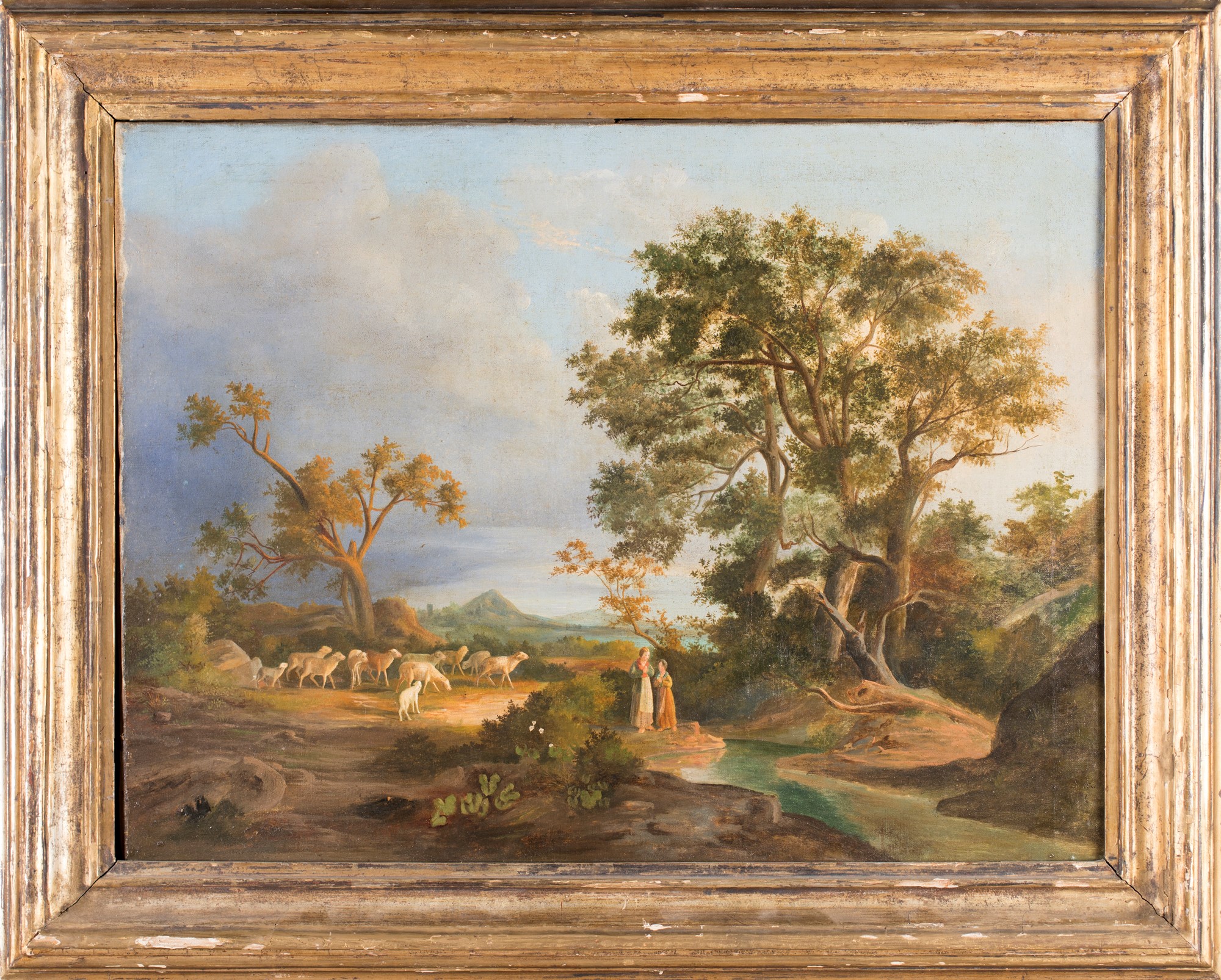 Pittore del XIX secolo Paesaggio montano con figure e pecore olio su tela cm...