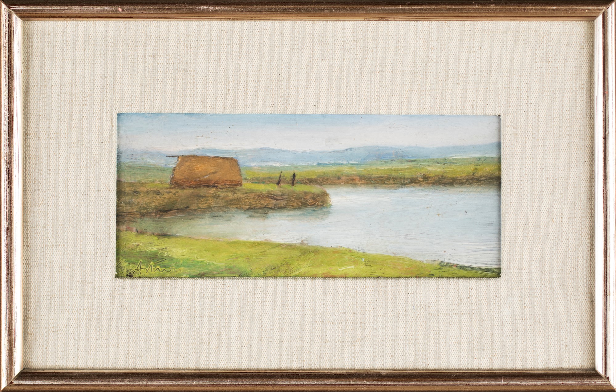 Antonio Asturi Paesaggio lacustre olio su cartoncino cm 8x19 (in cornice: cm...