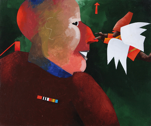 EMILIO TADINI Milano 1927 - Milano 24/09/2002 Fiaba olio su tela cm. 54x65, titolo e firma al retro, dichiarazione d'autenticità dell'artista datata 15/09/2000, etichetta della Arte Fiera, e timbro a secco della Galleria D.L. Arte (MI) su foto.