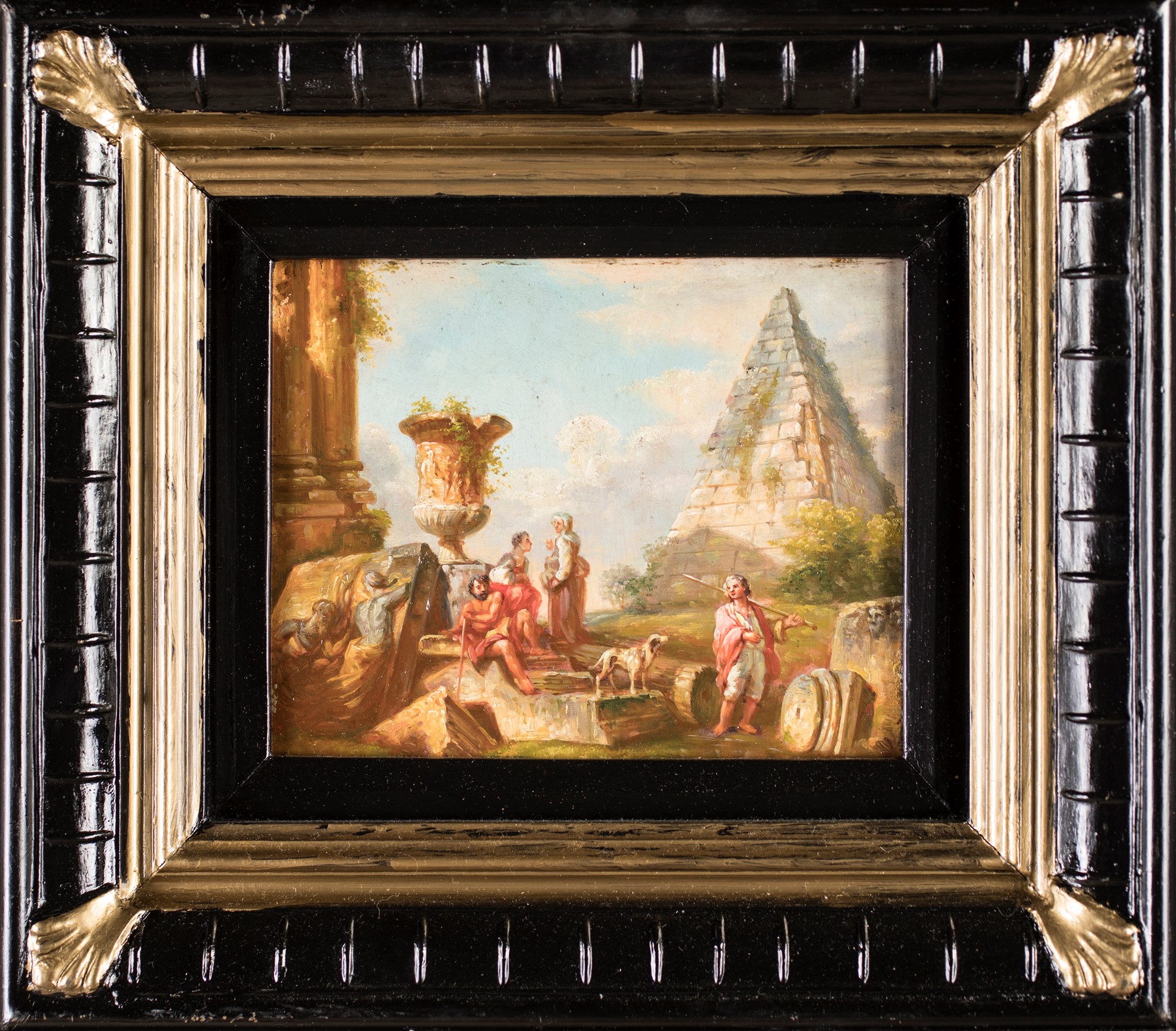 Paesaggio con piramide cestia e figure Cornice in legno ebanizzato e dorato
