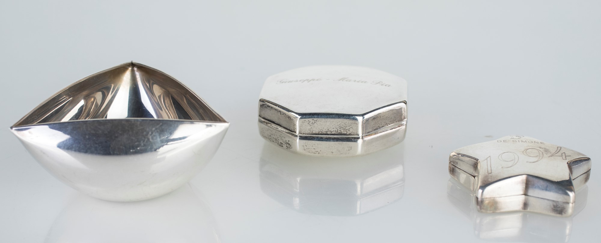 Lotto composto da tre bomboniere in argento sterling una coppetta triangolare dell'argentiere Jacente e due scatoline rispettivamente a forma di stella e ottagonale misure diverse - peso complessivo gr. 88