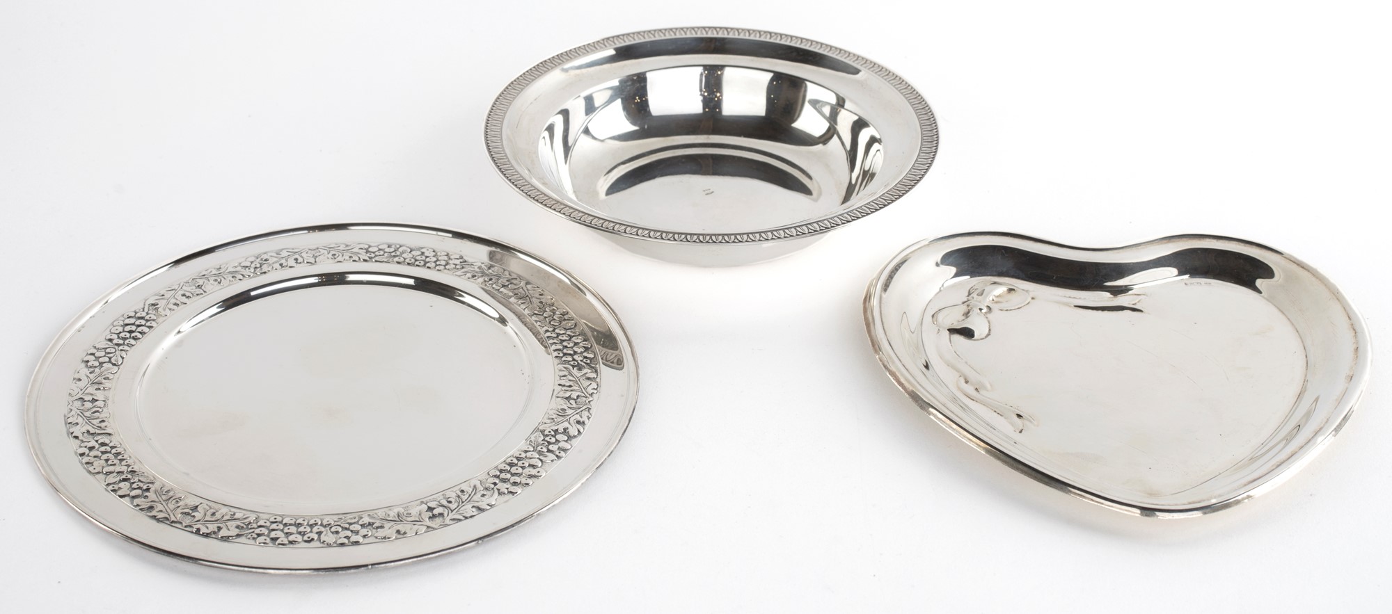 Vaschetta e due piattini diversi in argento la prima con tesa sottolineata da orlo a palmette, un piattino a forma di cuore con fiocco laterale sbalzato, il terzo con grappoli lungo la tesa 3x15,5 - cm 16x16 e diametro cm 18,3 - peso complessivo gr. 326
