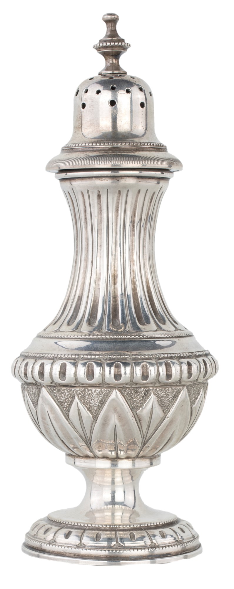 Spargizucchero in argento dalla tipica forma sottolineata da rilievi vegetali su piede circolare e coperchio a cupolino traforato altezza cm 17,5 - gr. 132