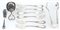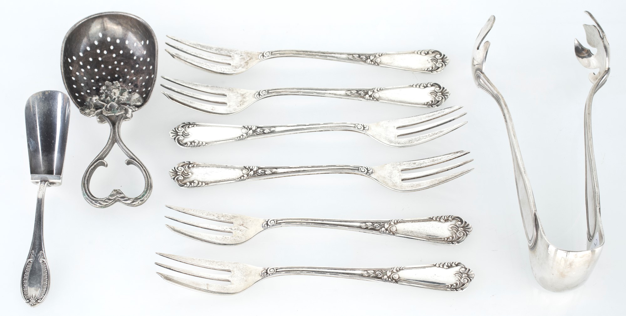 Lotto composto da nove utensili da tavola in argento: sei forchettine da dolce, una pinza per ghiaccio, un cucchiaio da zucchero dalla classica forma semicilindrica ed un colino peso complessivo gr. 204