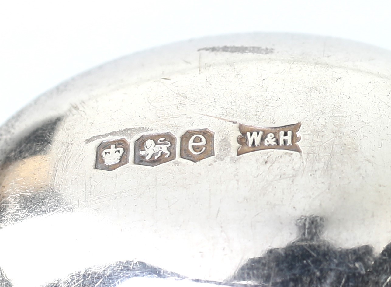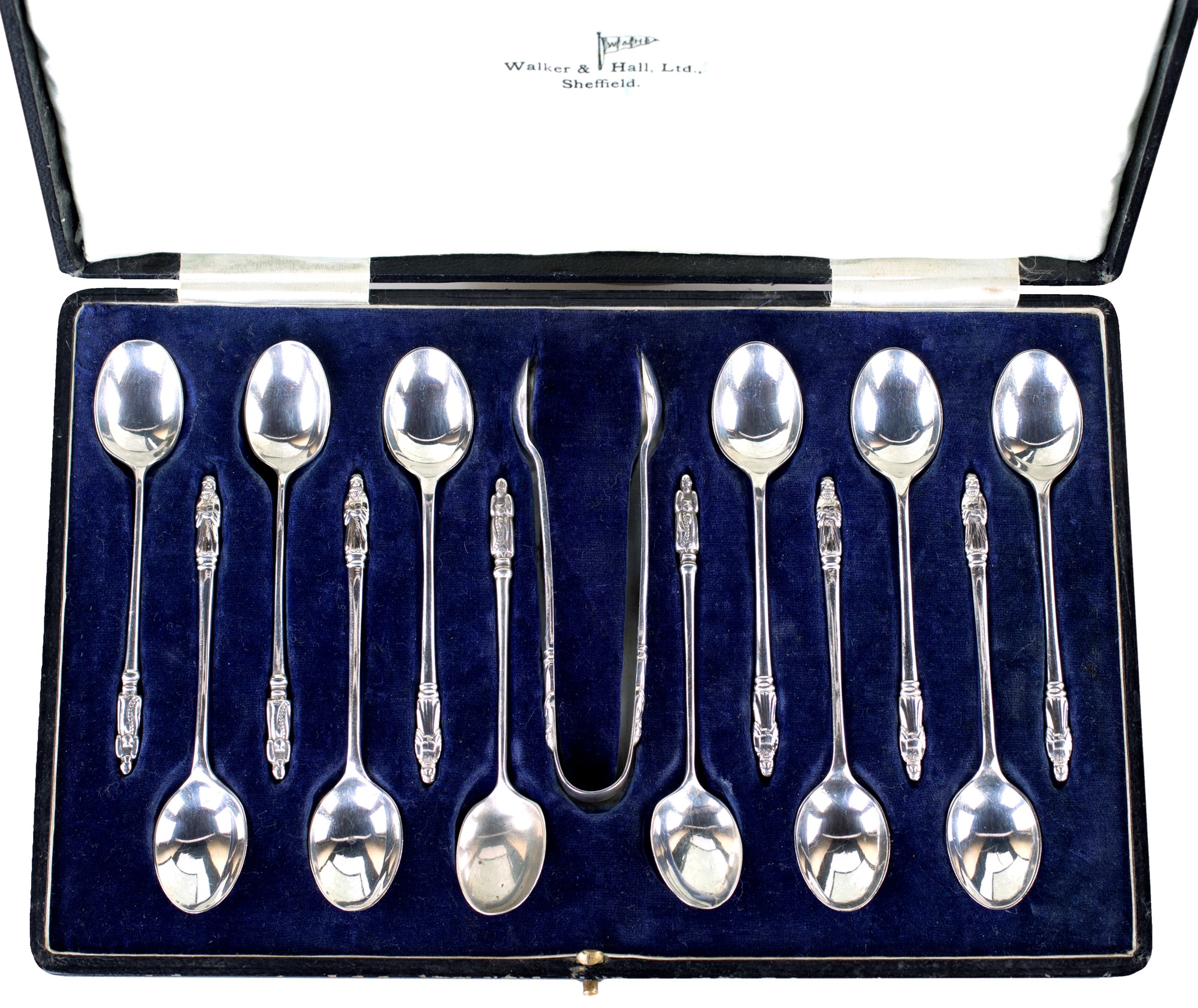 Dodici cucchiaini degli apostoli in argento 925/1000 con pinza per zollette, città di Sheffield 1922, argentiere Walker & Hall entro astuccio originale cm 11 - peso complessivo gr. 177 - misura dell'astuccio: cm 3x27x18