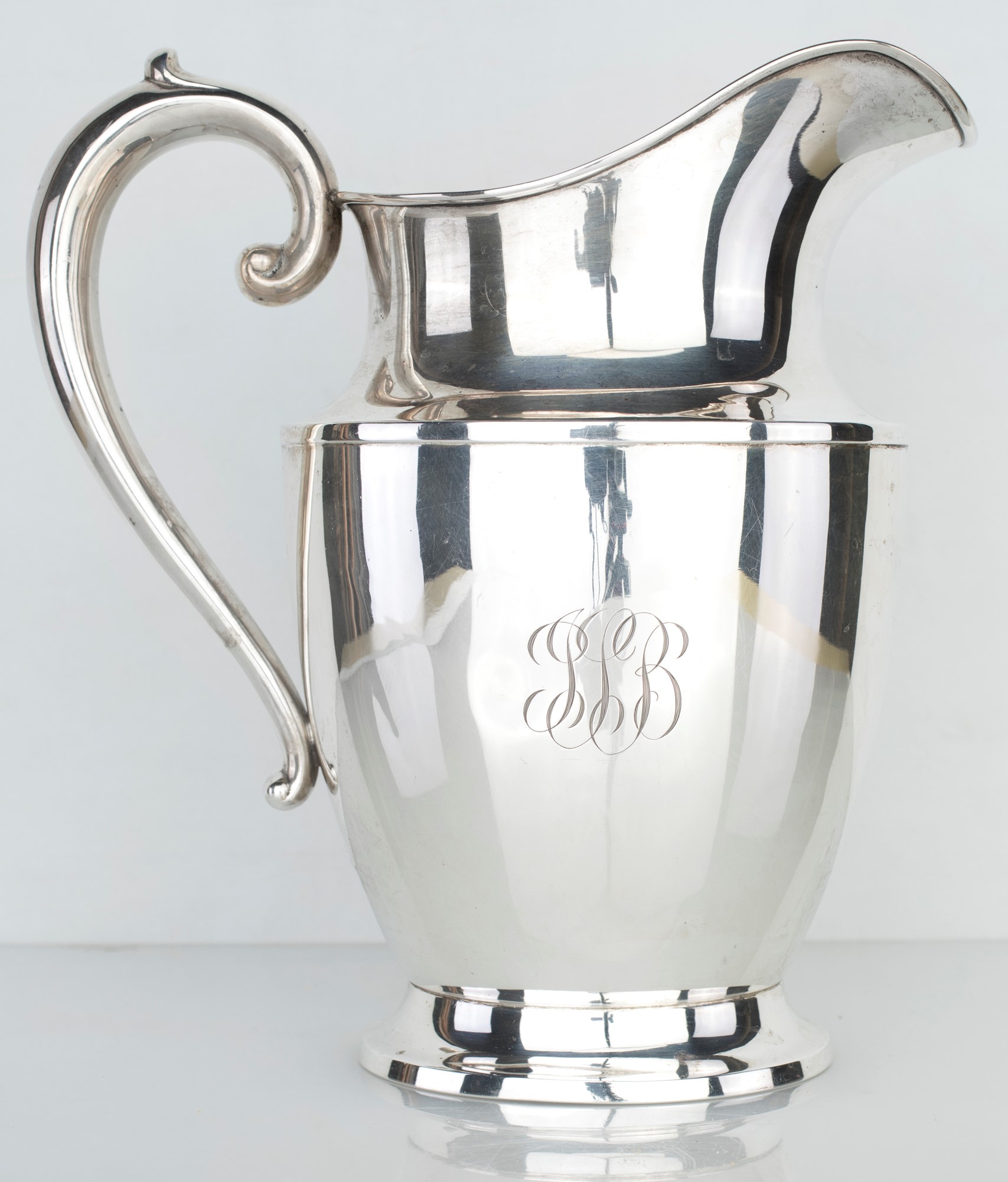 Brocca in argento sterling, Wallace, Stati Uniti d'America a superficie liscia centrata da iniziale incisa, manico sagomato altezza cm 23 - gr. 670