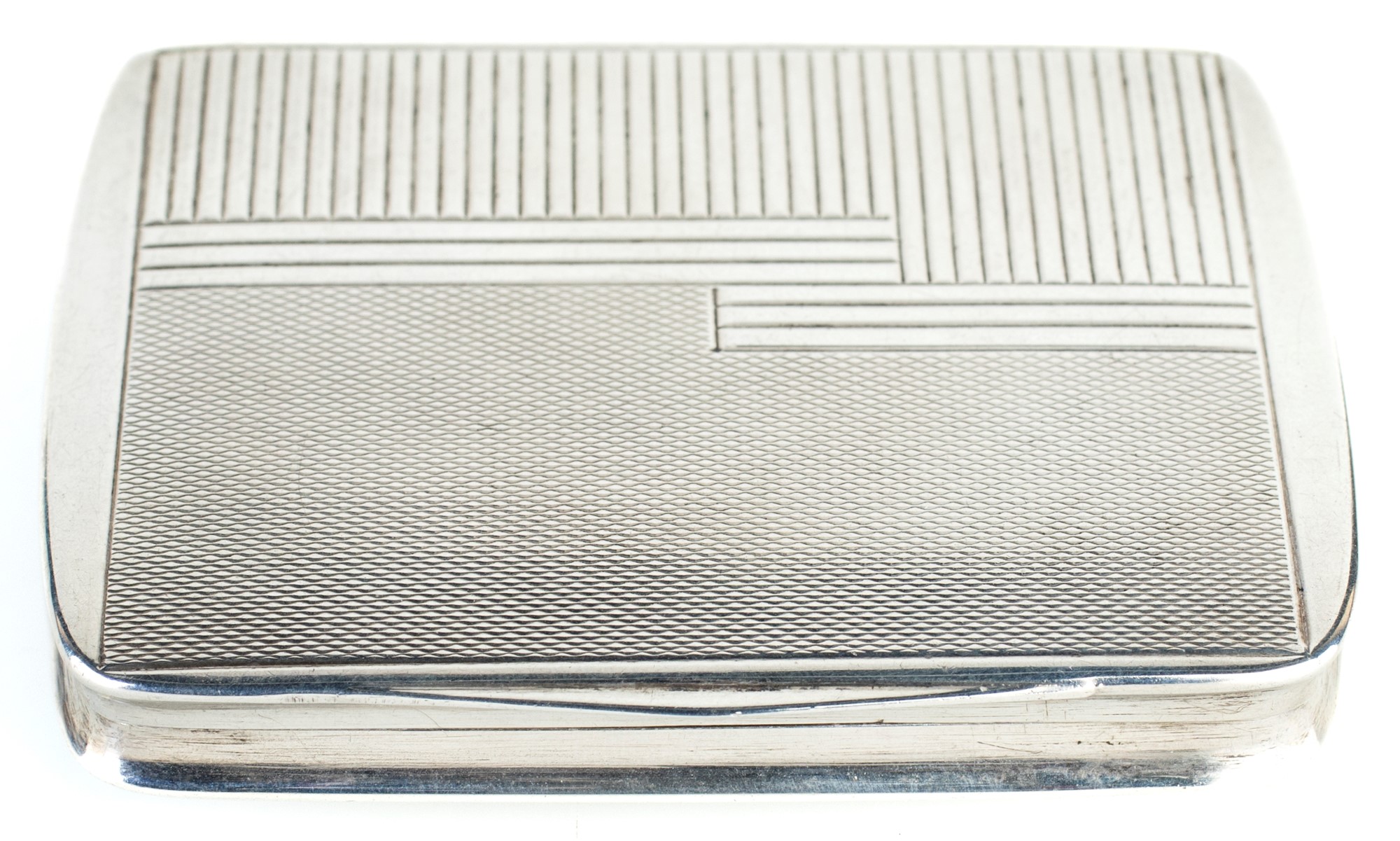 Portasigarette da tasca in argento, Firenze, periodo del Fascio, argentiere F.S. con coperchio minuziosamente cesellato a guilloché e ampia fascia a righe incise cm 1x7,7x6,2 - gr. 48