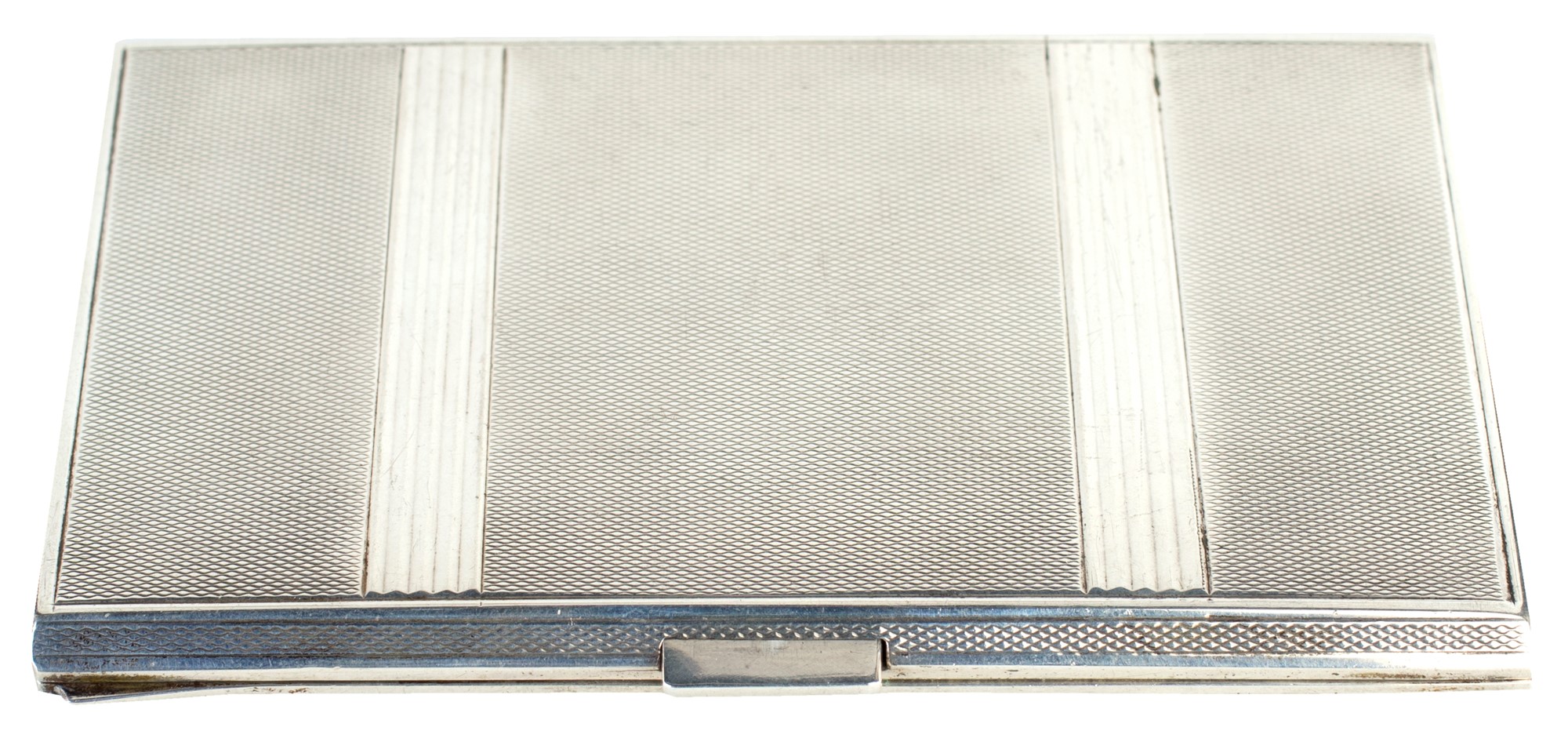 Portasigarette in argento, Firenze, Anni Quaranta/Cinquanta con superficie interamente cesellata a guilloché distinta da bande lisce scannellate; apertura con pulsante a scatto e fascia interna ferma sigarette a molla cm 0,7x12x8,3 - gr. 131