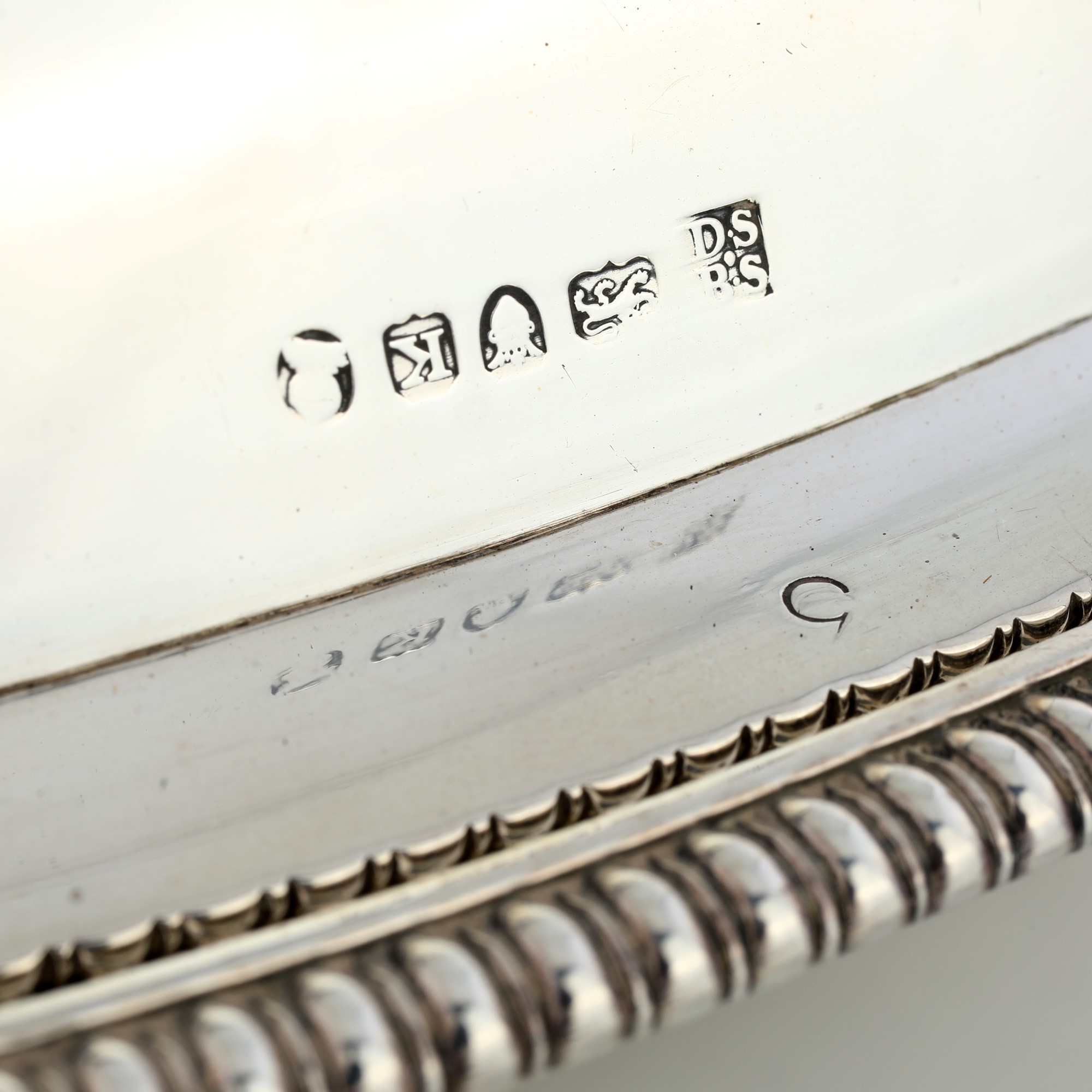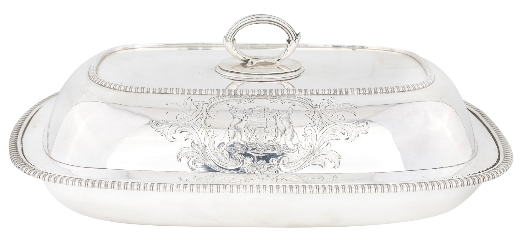 Legumiera in argento, Londra 1805, argentieri Digby Scott & Benjamin Smith di forma rettangolare con angoli arrotondati e profili sottolineati da cordone; coperchio a doppio uso con manico ad anello e doppio cartiglio inciso racchiuso da volute vegetali con stemma araldico e motto in francese antico "Vraye Foy" (True Faith) cm 12x32x22,5 - gr. 1798