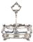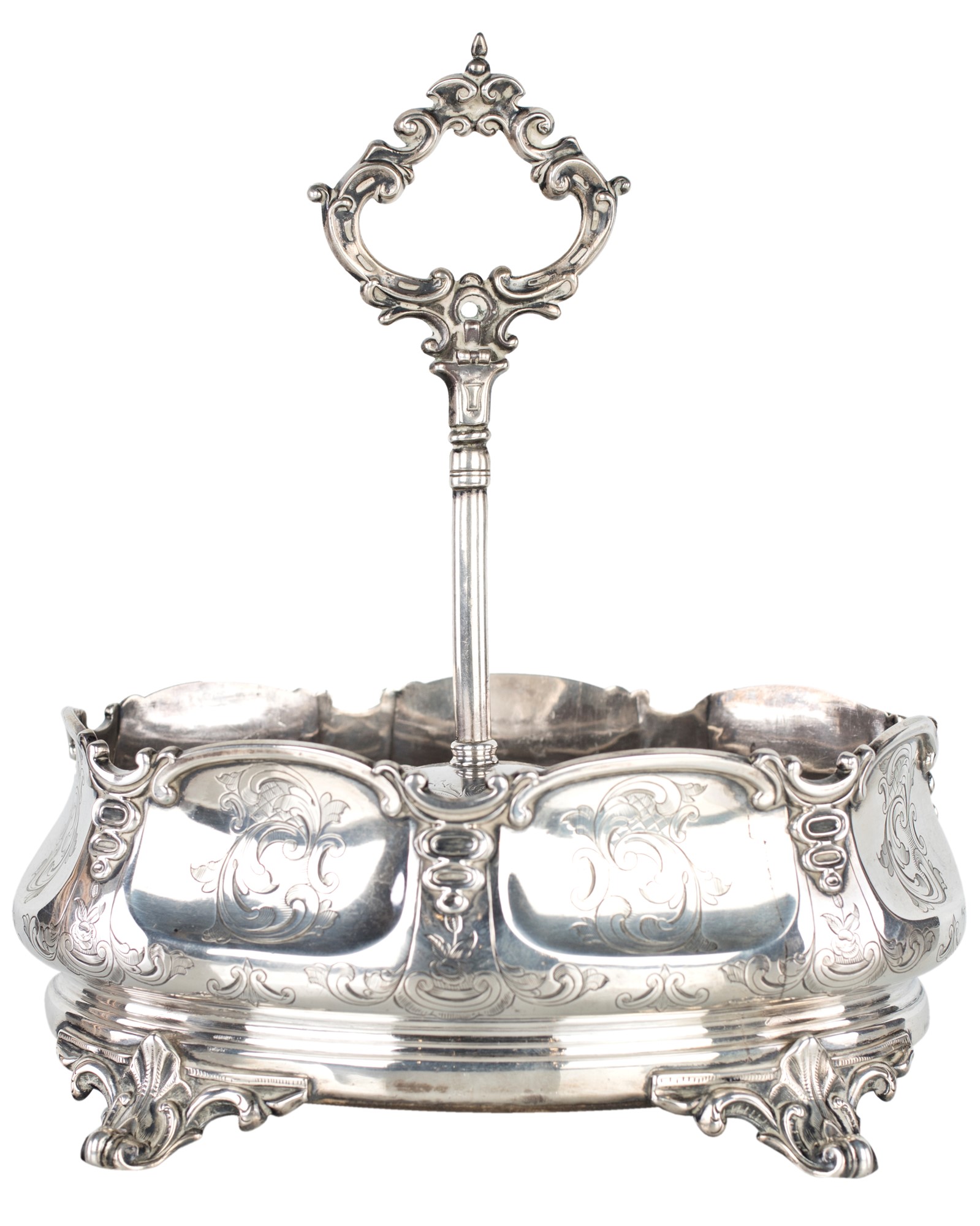 Portabicchieri in argento, città di Sheffield 1885, argentiere Martin Hall con struttura portante in legno ed ampia bordura sagomata ad andamento alternato concavo/convesso, decorata da cartigli incisi; presa centrale astile con estremità ad anello cm 25x20x16 - peso complessivo lordo: gr. 692