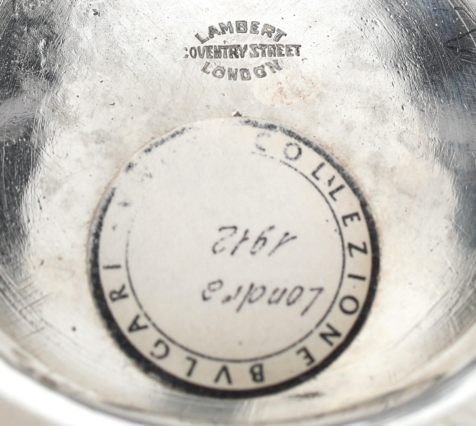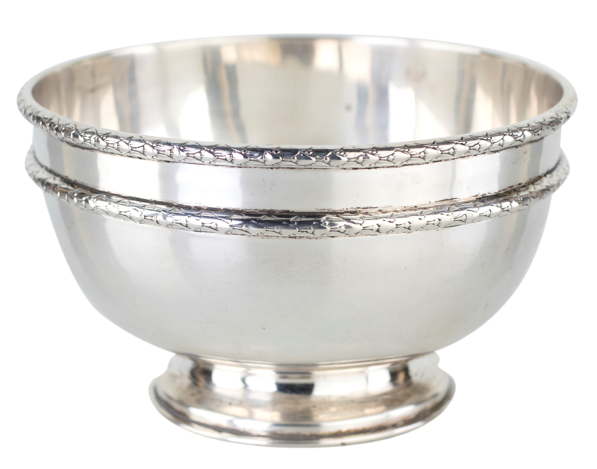 Coppetta in argento sterling, Londra 1912, argentiere Herbert Lambert a superficie liscia decorata da due cordoli cesellati a motivi vegetali; basso piede circolare. Provenienza: già collezione Bvlgari cm 7x11,7 - gr. 230