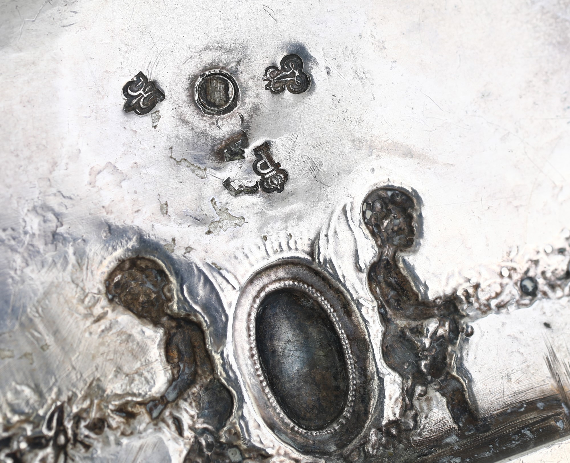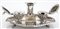 Calamaio in argento, Hanau, Germania, XIX secolo con portapenne cilindrico decorato da un fiocco e un'antina incernierata con una cesta fiorita incisa a chiusura di un piccolo vano portapennini; ai lati due gobelets porta inchiostro e spargi polvere a forma di coppa scanalata con coperchio incernierato sormontato da un fuso; vassoio ovale sagomato decorato da festoni e perline sbalzate poste lungo il perimetro, piedi zoomorfi 8x19x11 - gr. 300