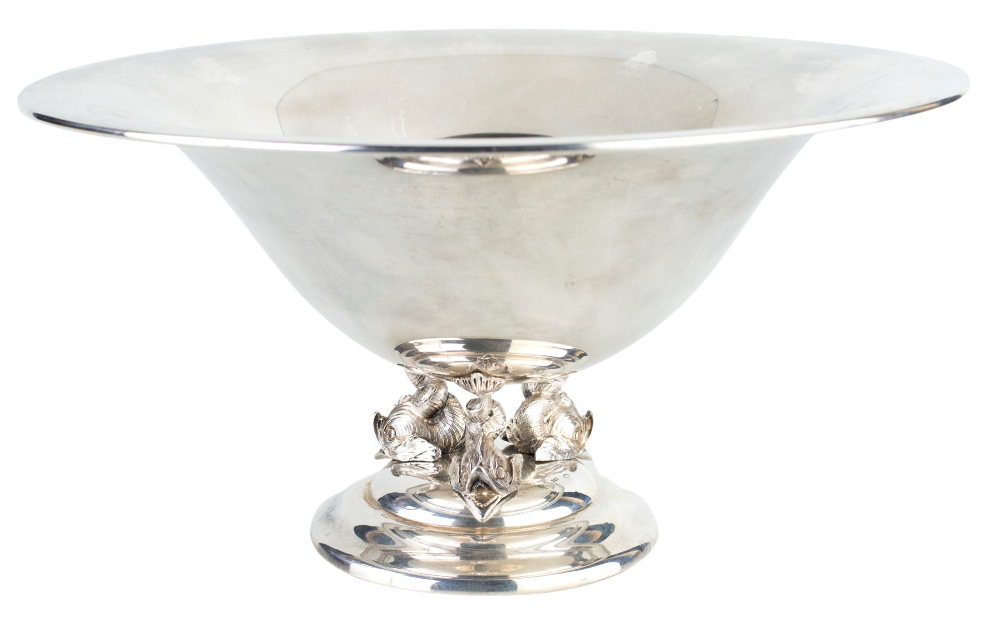 Centrotavola in argento 925/1000, Roma, periodo del Fascio, argentiere Ubaldo Vitali con coppa circolare fortemente svasata sorretta da tre figure scultoree di delfino; base circolare. L'argentiere romano Ubaldo Vitali ebbe la sua bottega in via della Croce 15 (successivamente via del Bottino), ed è il bisnonno dell'omonimo Ubaldo, anch'egli argentiere, vincitore del Genius Award e del Premio Università degli Orefici 2012 in America cm 15x28,2 - gr. 764