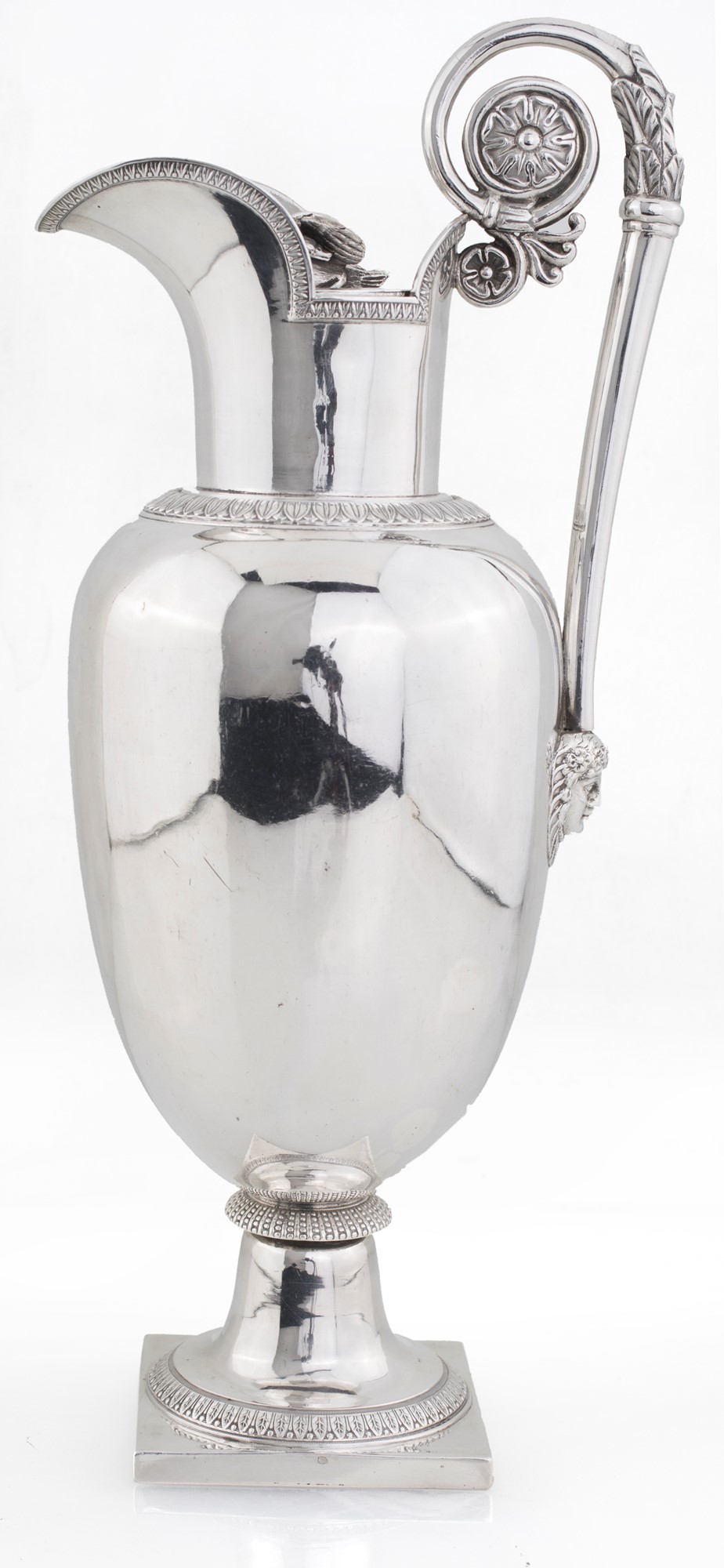 Versatoio in argento 950/1000, Parigi 1793, argentiere Jean Nicolas Boulanger (attivo dal 1783) con corpo ad anfora a superficie liscia decorata da due ordini di palmette poste lungo il profilo del piede e alla base del collo; manico emergente da mascherone terminante a ricciolo centrato da corolla 30,5x14 - gr. 695
