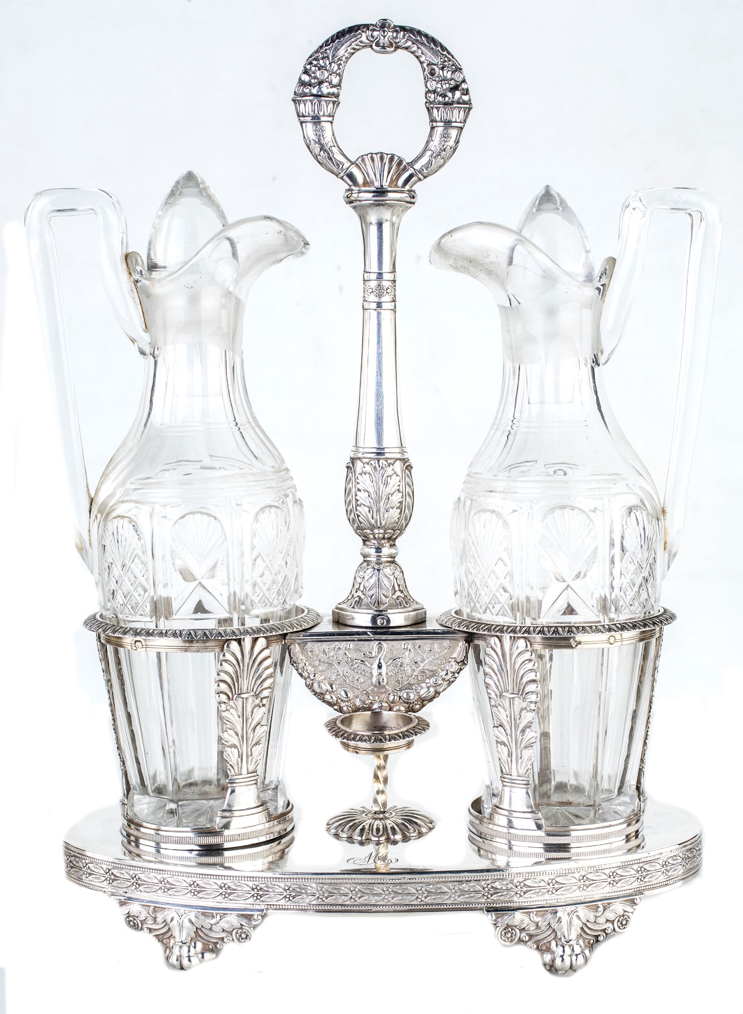 Oliera in argento 950/1000, Parigi 1820 ca., argentiere S.J.P supporto ovale con fascia percorsa da un tralcio sottile con foglie binate entro perline infinitesimali, sorretto da piedi ferini raccordati da foglie e sormontato da due porta ampolle con palmette raccordate fra loro da un elemento semicircolare incorniciato da ghirlanda sbalzata, ornato da un cigno ritratto ad ali spiegate fra sottili tralci fioriti; presa centrale sormontata da un anello in forma di cornucopie affrontate. Ampolle coeve in cristallo intagliato cm 32x24x12 - gr. 547