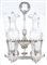 Oliera in argento 950/1000, Parigi 1820 ca., argentiere S.J.P supporto ovale con fascia percorsa da un tralcio sottile con foglie binate entro perline infinitesimali, sorretto da piedi ferini raccordati da foglie e sormontato da due porta ampolle con palmette raccordate fra loro da un elemento semicircolare incorniciato da ghirlanda sbalzata, ornato da un cigno ritratto ad ali spiegate fra sottili tralci fioriti; presa centrale sormontata da un anello in forma di cornucopie affrontate. Ampolle coeve in cristallo intagliato cm 32x24x12 - gr. 547