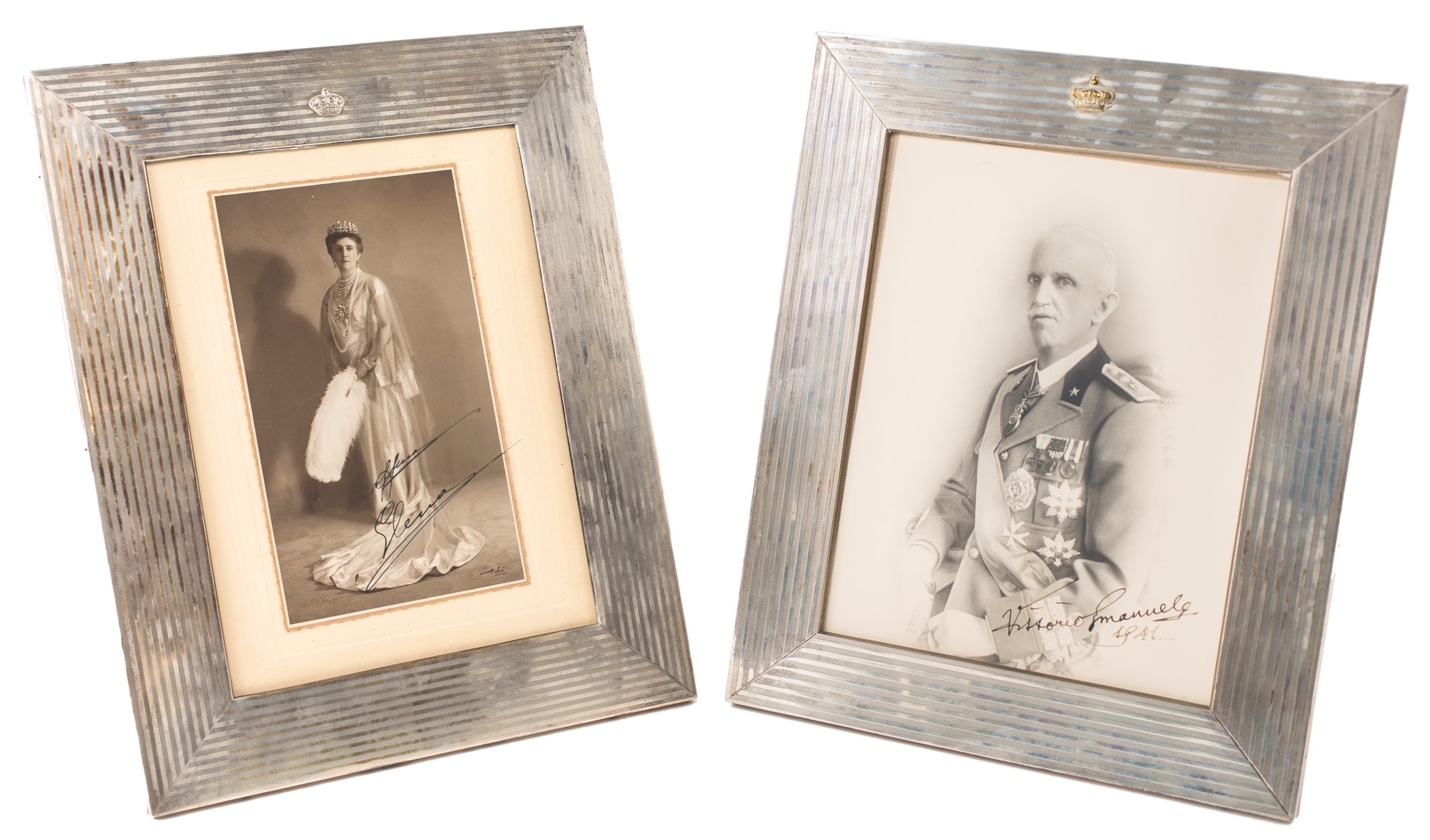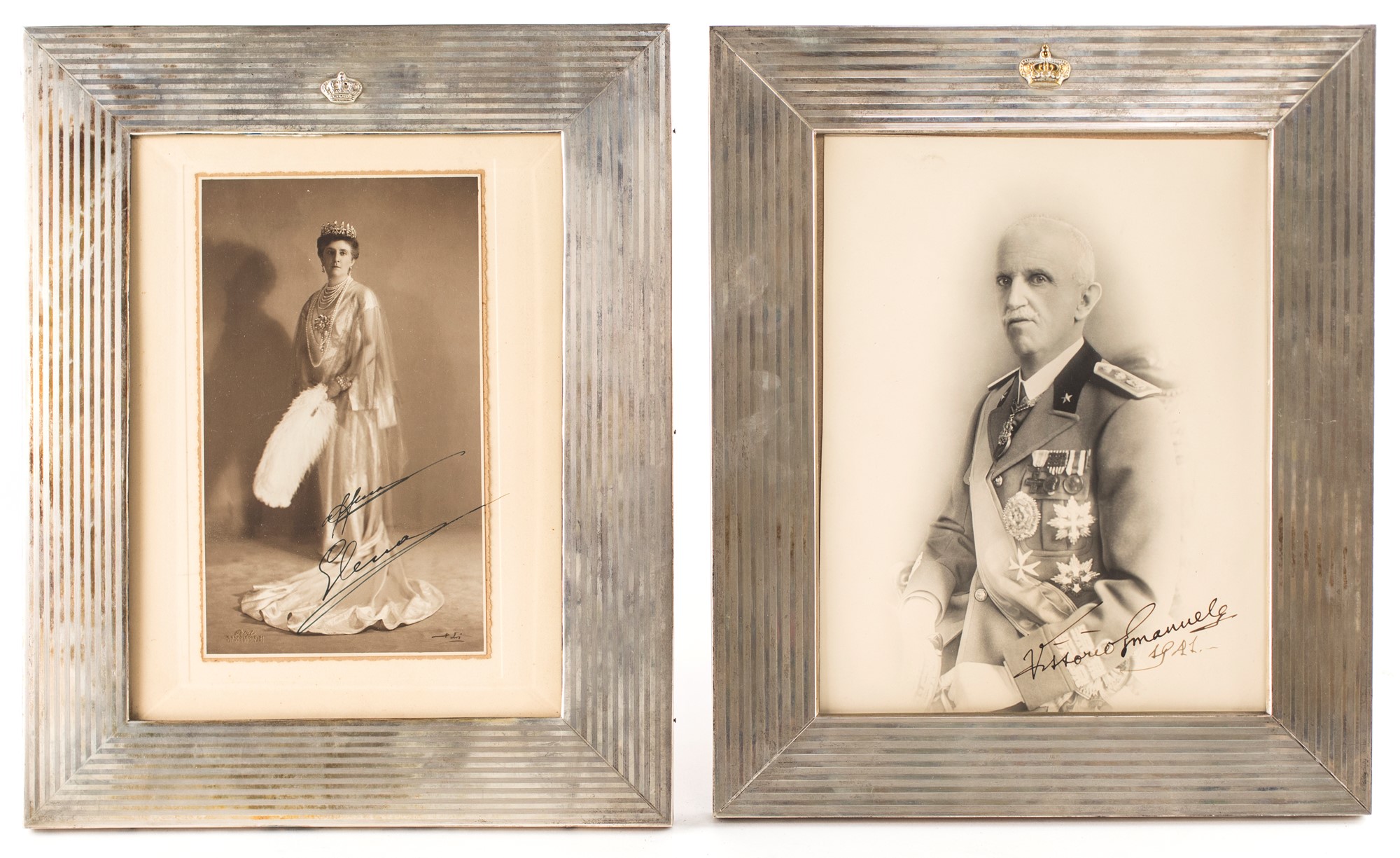 Due cornici da tavolo in argento a titolo 800, prima metà del XX secolo a fascia piatta percorsa da righe incise, impreziosite al centro del lato superiore da piccola corona applicata; all'interno fotografie con firma autografa di Vittorio Emanuele III di Savoia Re d'Italia datata 1941 e della Regina Elena. Una reca firma dell'argentiere A. Ferrari Trecate Roma cm 37,5x31 (luce interna cm 27,5x21,5) e cm 38,5x31 (luce interna: cm 28x20,5) rispettivamente