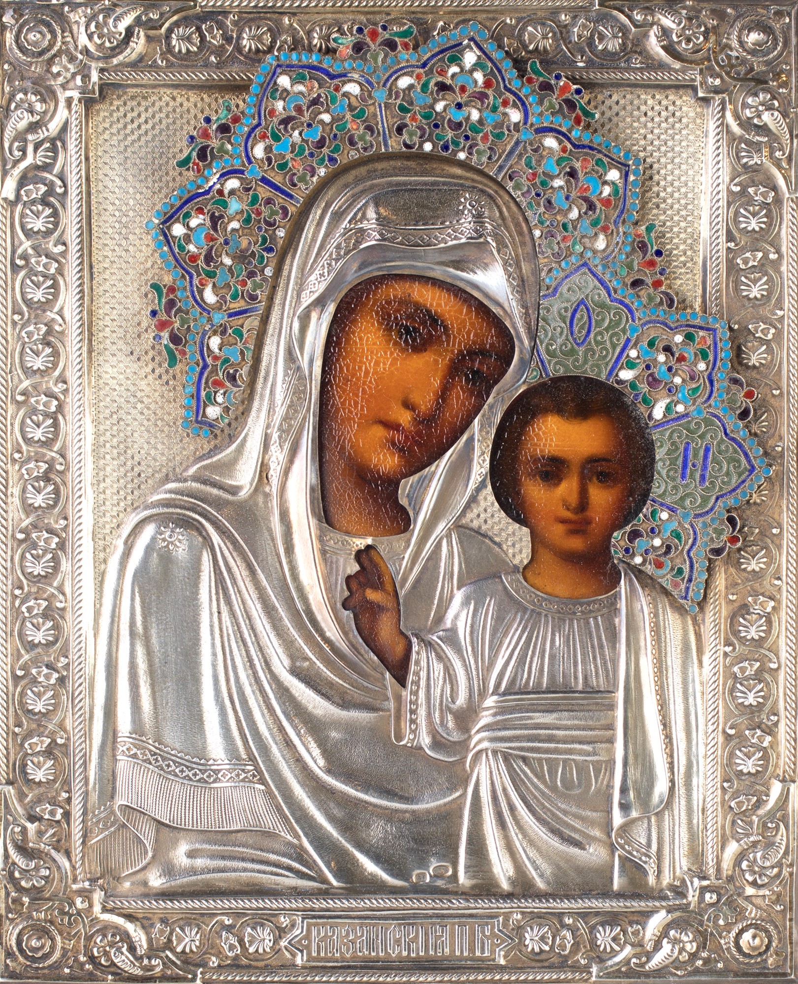 Icona, Russia, XIX secolo raffigurante Madonna col Bambino, con ritza in argento e aura arricchita da smalti policromi. cm 22,5x18