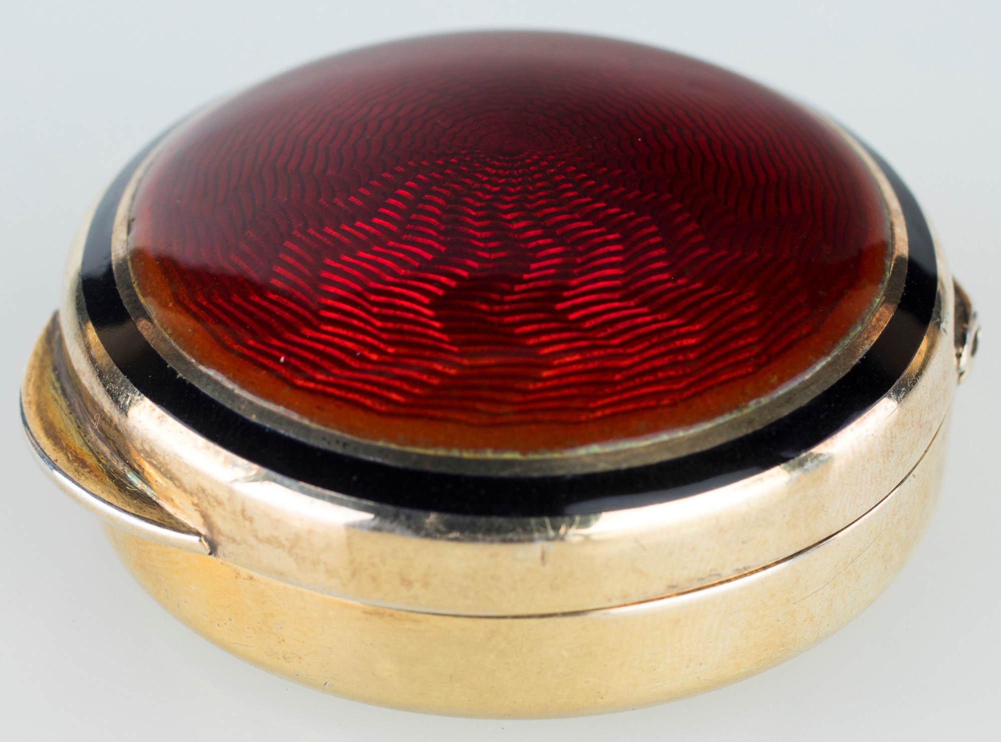 Portapillole in argento sterling dorato e smalto rosso, argentiere Salimbene, Firenze Anni Sessanta di forma circolare con coperchio incernierato decorato a guilloché sottosmalto cm 1,3x4,2 - gr.