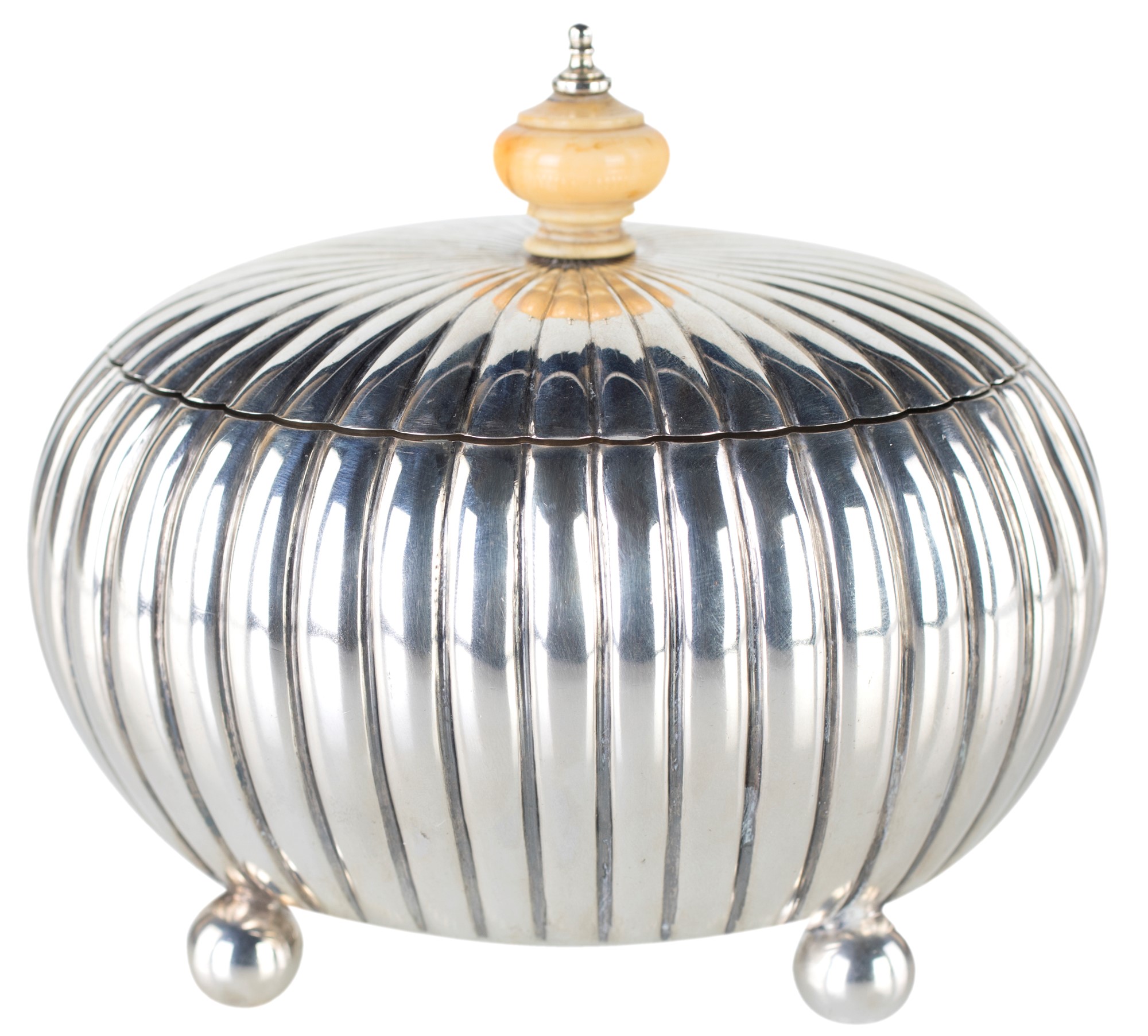 Scatola portagioie in argento, Germania, inizi del XX secolo, argentieri Kooch & Bergfeld di Bremen di forma ovale interamente baccellata; coperchio incernierato sormontato da pinnacolo in avorio, quattro piedi a sfera cm 11x13x9 - gr. 321