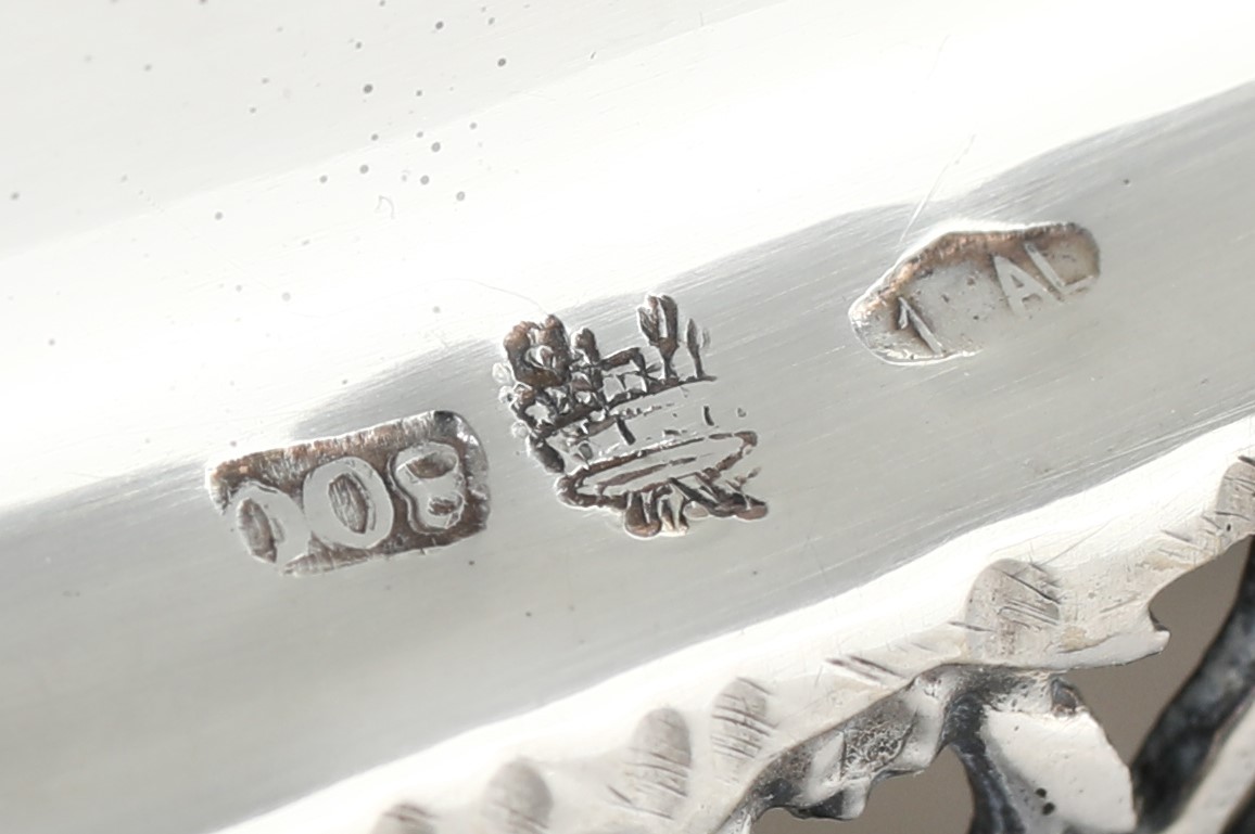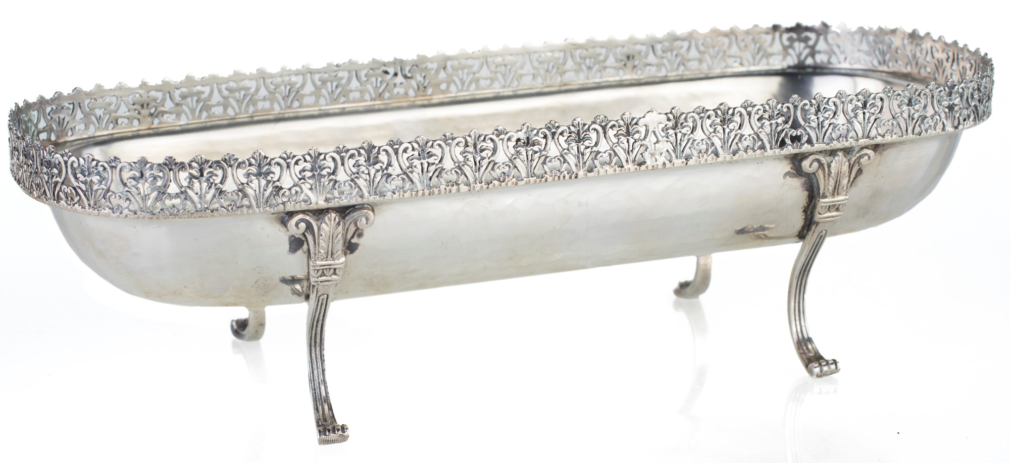 Centrotavola in argento, Alessandria, Anni Cinquanta, argentiere Cesa di forma rettangolare arrotondata sorretto da quattro piedi incurvati con estremità ferina e attacco a palmetta; bordo traforato a motivi vegetali. All'interno struttura rimovibile in plastica atta a sostenere fiori recisi cm 8,5x28x11,3 - gr. 504